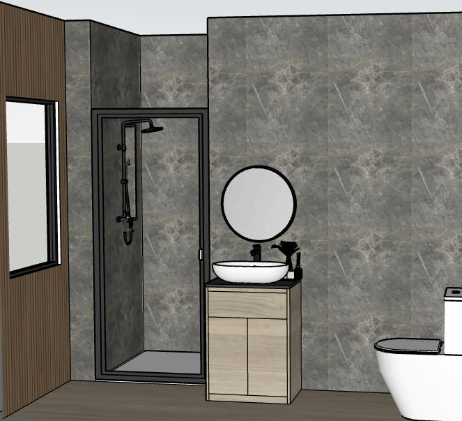 late afternoon light with wall light on above the mirror and led strip light in the shower niches with a single flush spotlight over the shower and one over the toilet