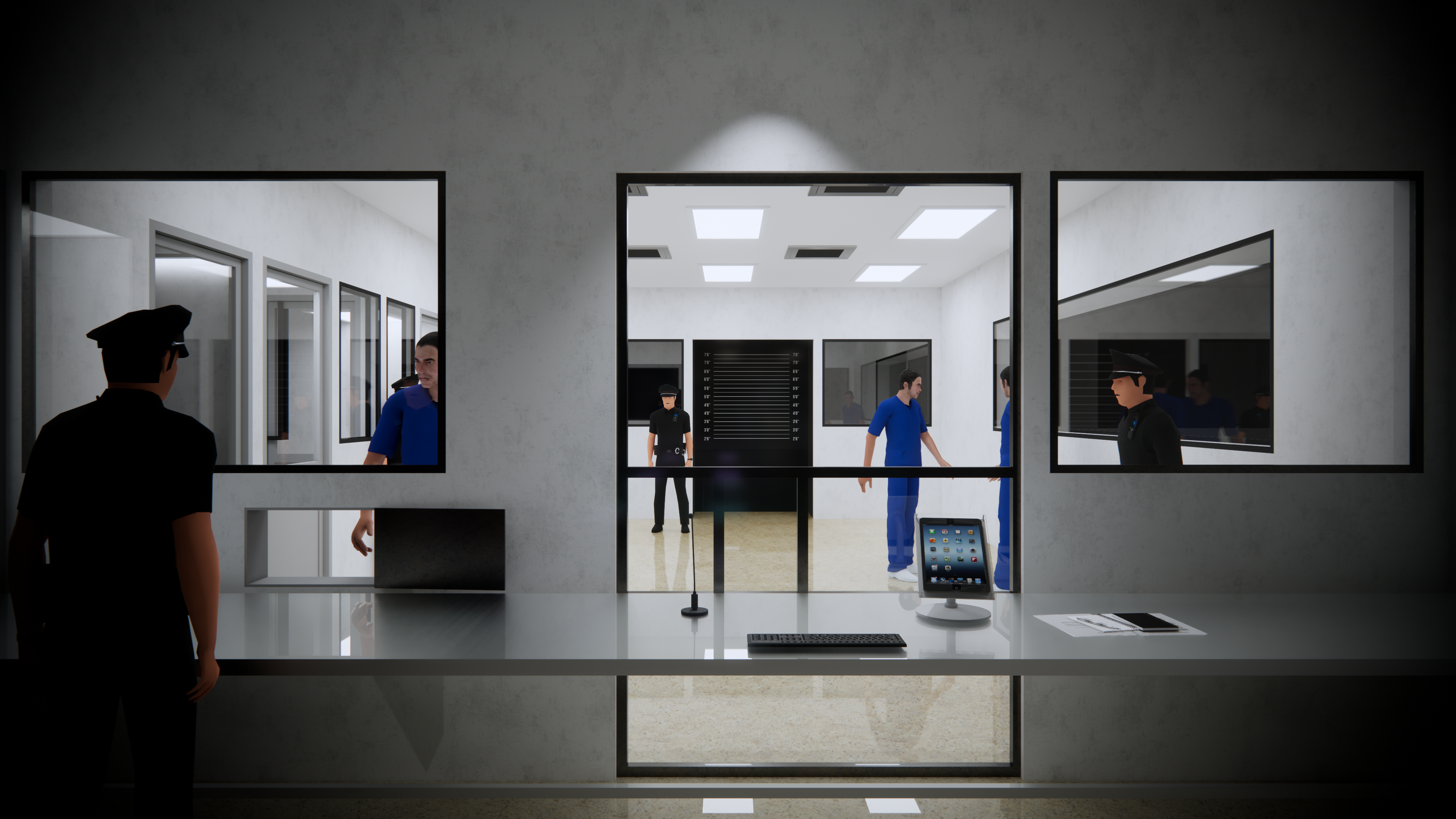 add rough texture to all the white walls and to the metal table illuminate all the doors