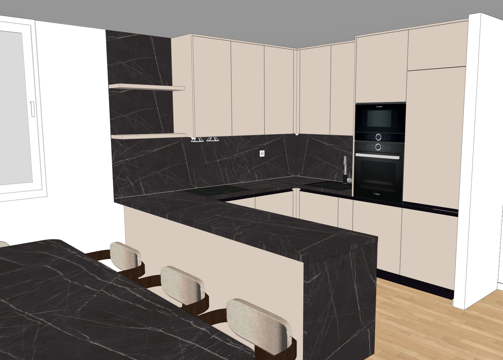 everything is matte including the table and worktop underneath the above elements is led lighting there is no led lighting under the shelves