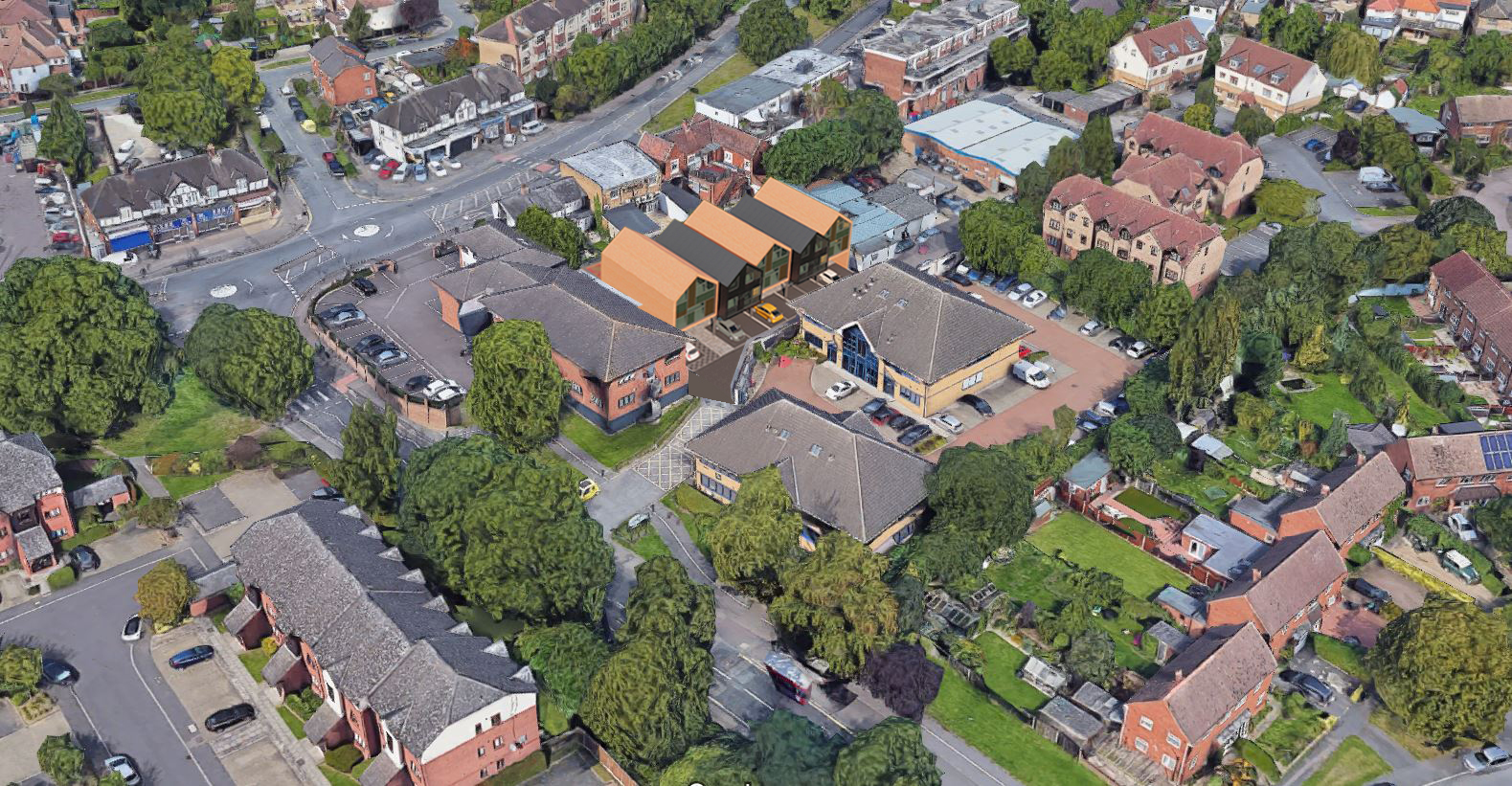 proposed sketch model superimposed in centre of image add realism match shadows and realistic uk morning light with grey sky and strong diffuse global lighting