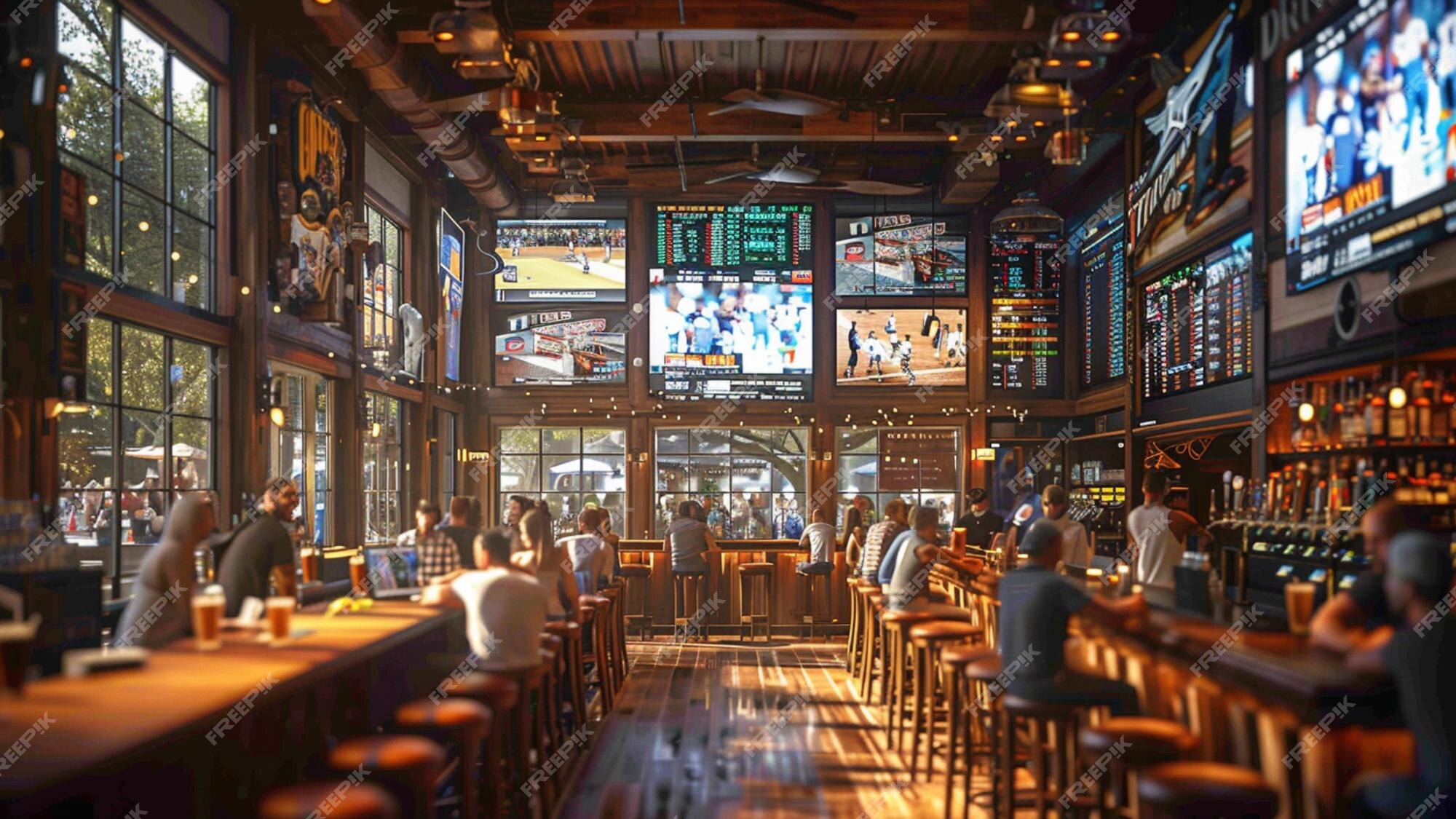 interior shot tv screens with a sport events on the walls giant windows bright sunny day outside the windows