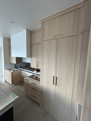 do not change the cabinets at all preserve the exact cabinet colors materials finishes door style drawer style hardware proportions reveals geometry and alignment exactly as shown do not alter the countertop flooring walls ceiling angles perspective lighting direction appliances or any architectural elements keep the camera viewpoint absolutely identical only remove clutter construction materials and unfinished areas clean the room and make it look fully finished add only minimal tasteful staging items appropriate for the space do not add any furniture or change anything about the cabinets countertop or room structure no cabinet changes no perspective changes no angle changes no color changes no resizing no shape changes no geometry changes no filler changes no hardware changes no new cabinetry no wall changes no added shadows that distort structure add a 48 slide in range below the hood to fit the opening add countertops to the base cabinets stage as a kitchen do not add or change anything else about the cabinets do not add more cabinets the layout must stay as is