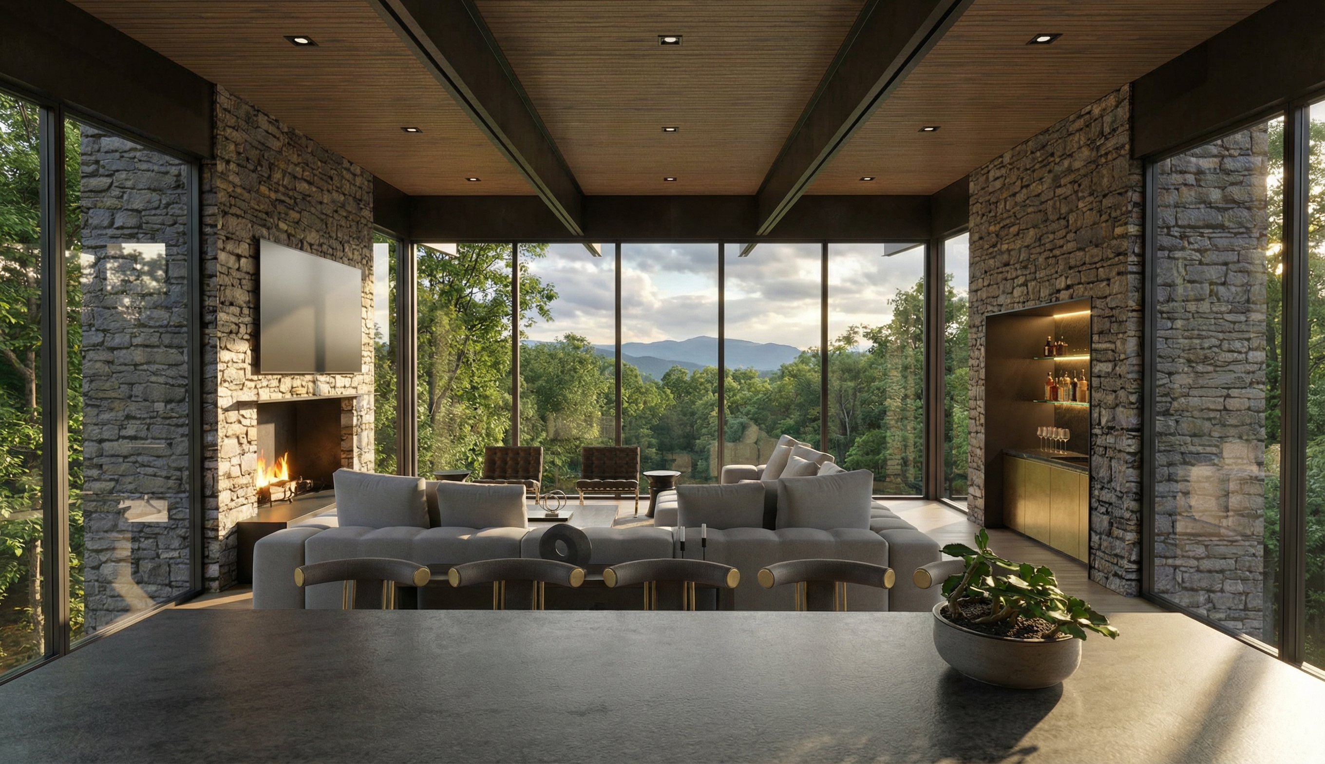 create a photorealistic rendering of a luxury coastal modern residence this is house on stilts no walls on ground floor only 16 x 16 columns with a bright white 7 hardi plank on the left portion and with metal gray roofing the window framinng are all white while the glass are gray tint the railings are all in white color the brackets are also white surrounded by lush greenery in florida setting surround it with palm trees and a dawn setup with lights lit up and the house shows swimming pool at the rear of the house sand in the foreground as this is a beach area