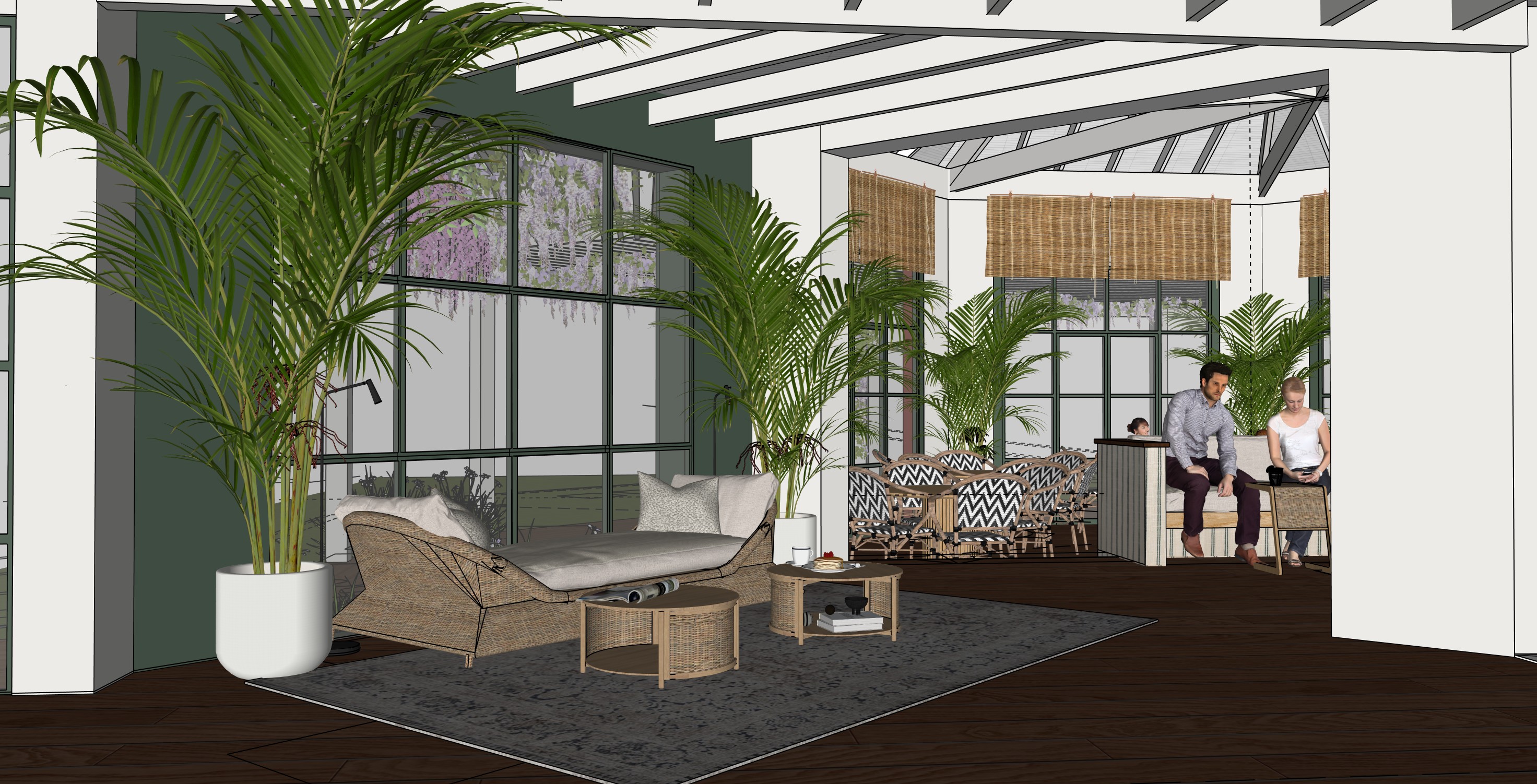 add golf field in the outside background warm light inside keep colours textures and furniture as is deco magazine quality