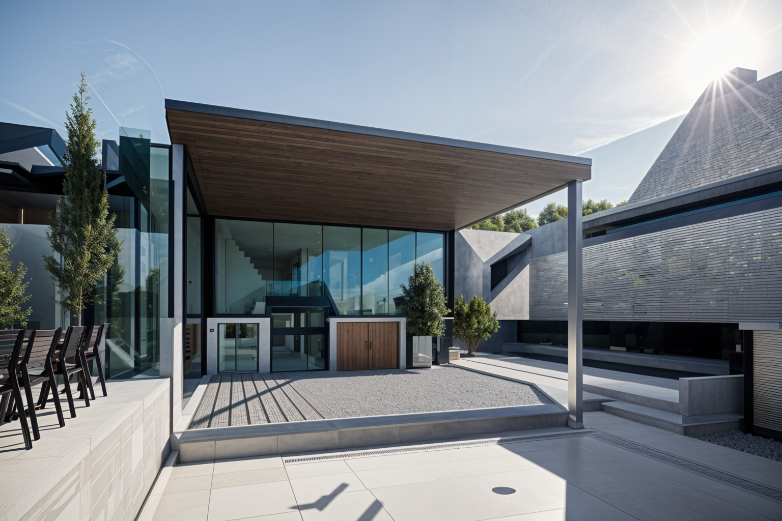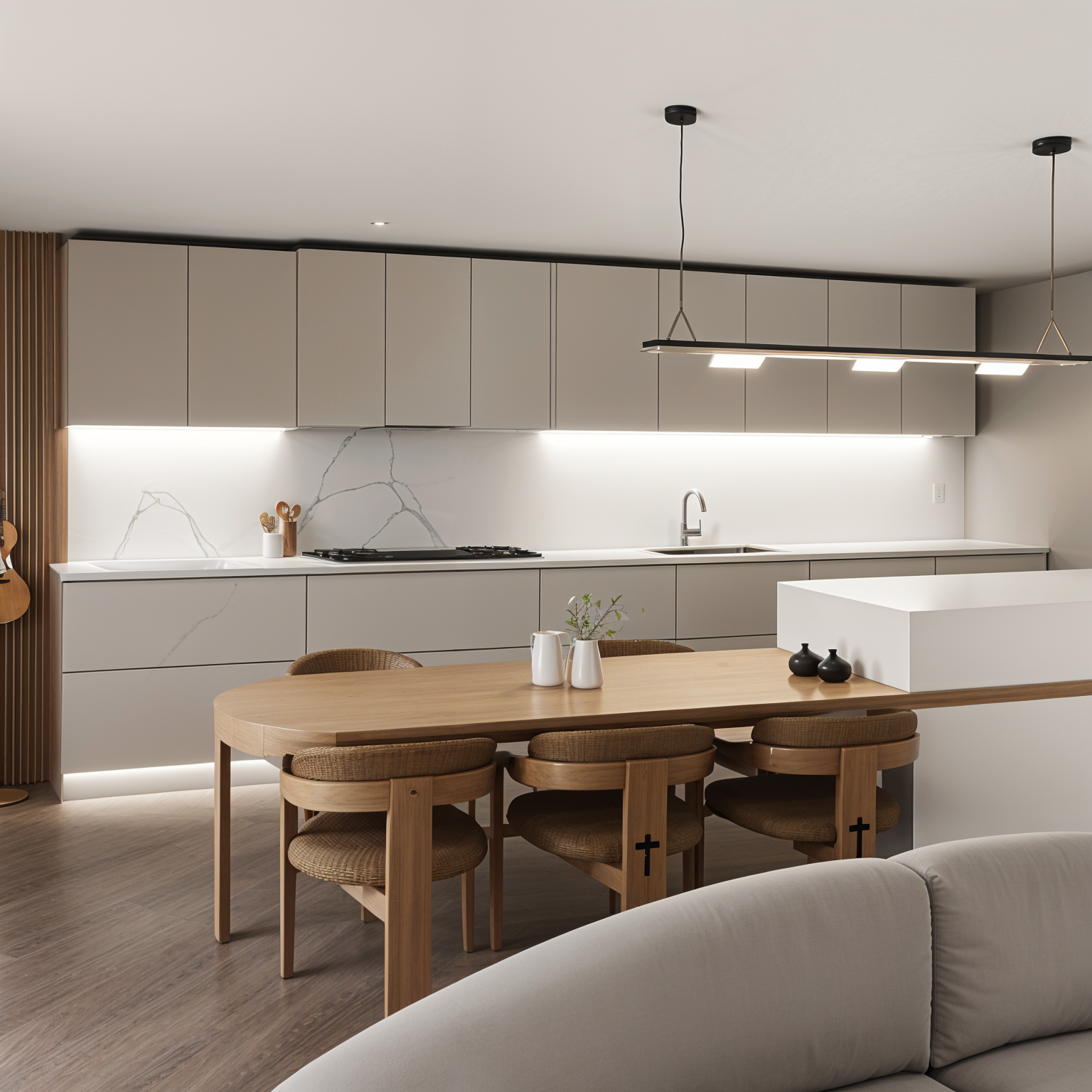 make the image appear realistic with a balanced mix of natural and artificial lighting but without showing any lamps above the backsplash or any direct light sources use satin smooth and clean textures avoid overly rough or bold patterns while still maintaining a realistic appearance adjust the window area to appear brighter and include an outdoor view the floor specifically using a grey terrazzo ceramic finish