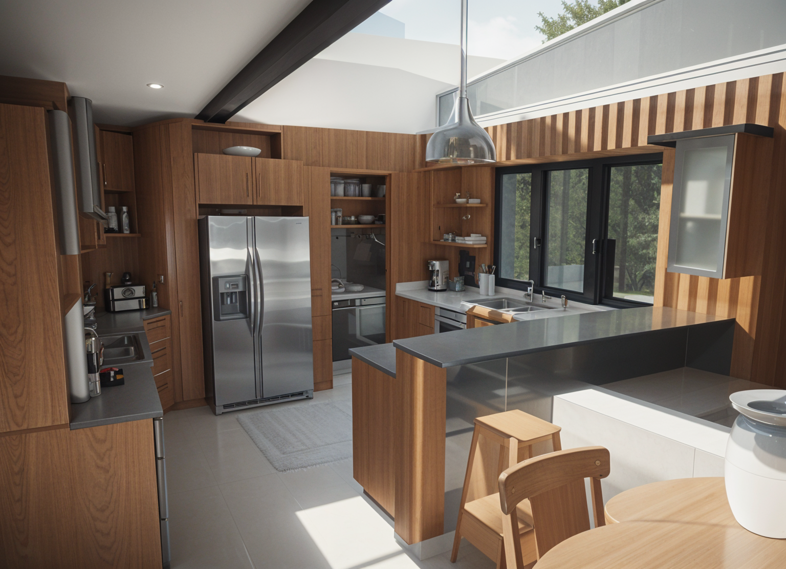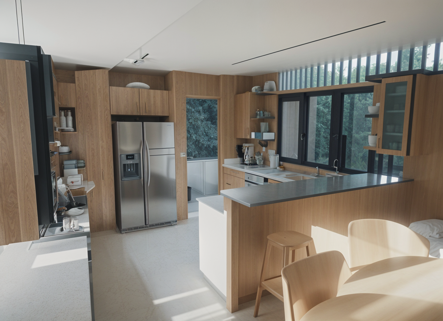 modernist exterior shot generate an ultra realistic image of this kitchen make the window frames black no open cabinets mountain modern style keep walls windows and appliances in the same positions architecture