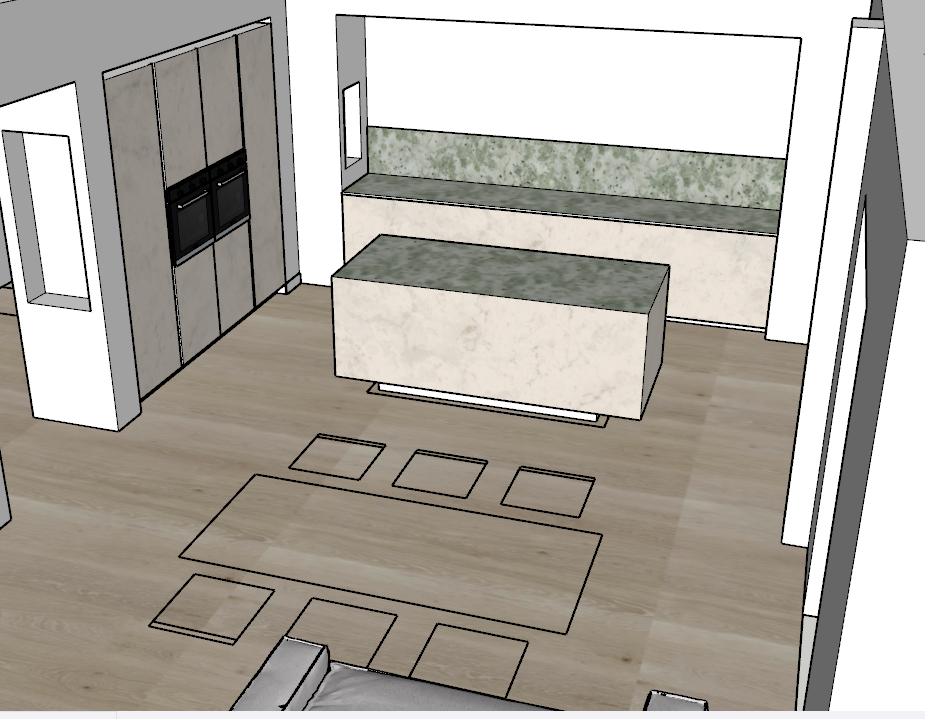 proponimi un design per questa cucina considerando le colonne l isola e le basi come un unicum deve avere un design puro moderno accattivante ma classico i piani in marmo aggiungi anche un tavolo dove lo vedi in pianta davanti all isola vorrei poltroncine al posto delle sedie e colori piu eterei