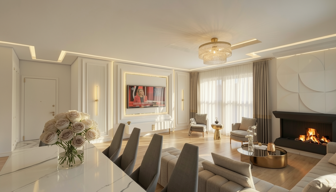 render this picture with calacatta prado quartz on the counter tops and on the backsplash show a white 12 x 24 light grey tile floor add under cabinet lighting change the cabinet pull hardware to gold change faucet to gold and an undermount truffle sink