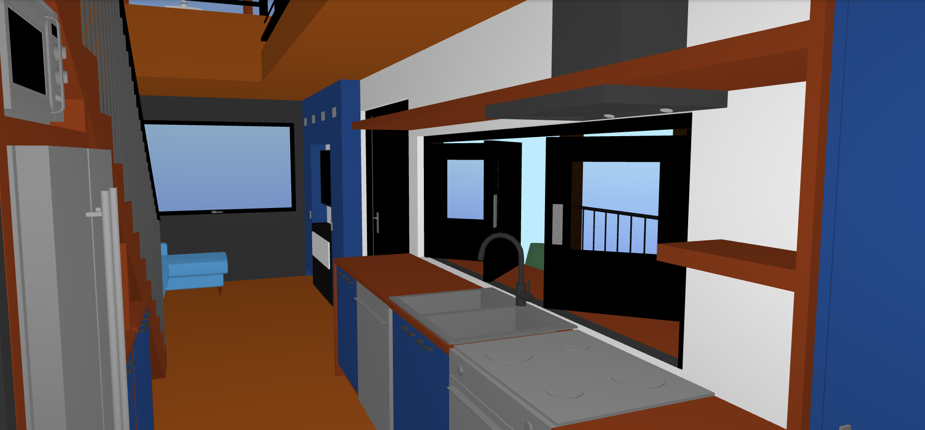 this is the kitchen of a small tiny home towards the living room above the sink there is a 4 piece bi fold window leading to the outdoor bar on the covered deck the floor and ceiling are both reddish stained walnut planks going back and forth the living room has a large picture window to the right there is a large gas fireplace under the tv with blue cabinetry for storage surrounding the tv and fireplace the home is on a grassy lot with pine and spruce trees around the property with golden hour lighting