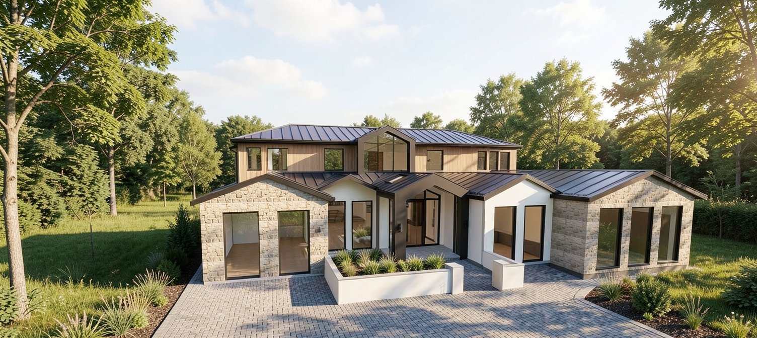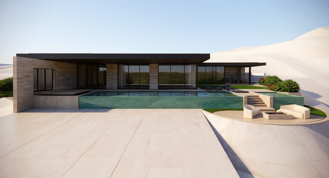 this is a new build kitchen this kitchen should have mahogany stained wood cabinets around the perimeter the upper cabinets should have glass fronts and led lights with wine glasses in them dark islands all countertops should be a white taj mahal quartzite the floor should be a medium color white oak wood plank floor there should be lots of natural daylight there should be a fridge and freezer in the space to the left add three off white upholstery barstools at the island
