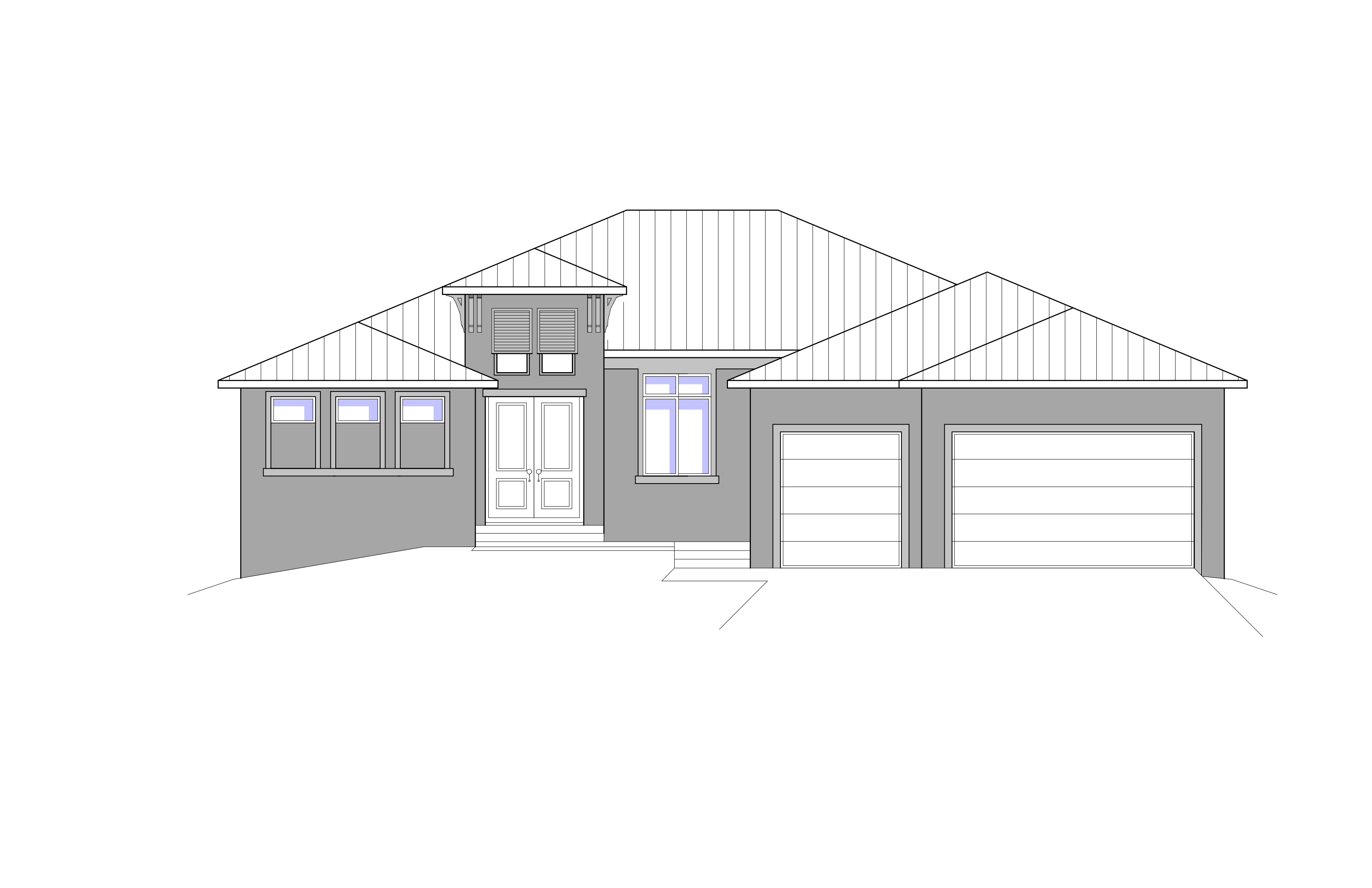 show a light grey standing seam metal roof dark grey corbels dark grey banding around windows and garage doors windows to the left of the entry are 36 wide x 21 high top at 96 above the finished floor with 36 wide by 36 high white wall space between the bottom of the window and the horizontal banding there are 2 dark grey bahama shutters above the entry windows the entry doors are 2 panels each and painted dark grey the garage doors are light grey the base house is smooth finish stucco painted white dark grey dappled paver sidewalk with 4 steps terraced from entry doors sweeping wide to the garage tropical landscape with blue sky and fair weather clouds