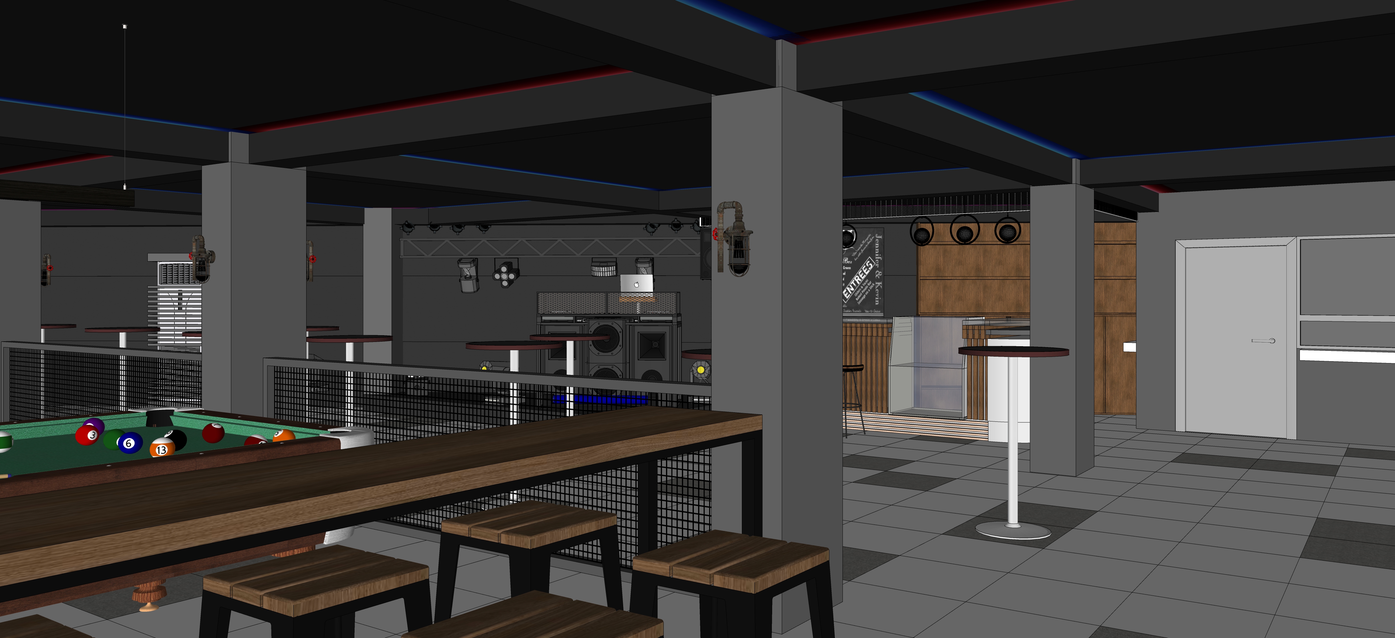 render and interior bar make the couch leather add some realistic people make an acoustic accent on walls in modern industrial interior design