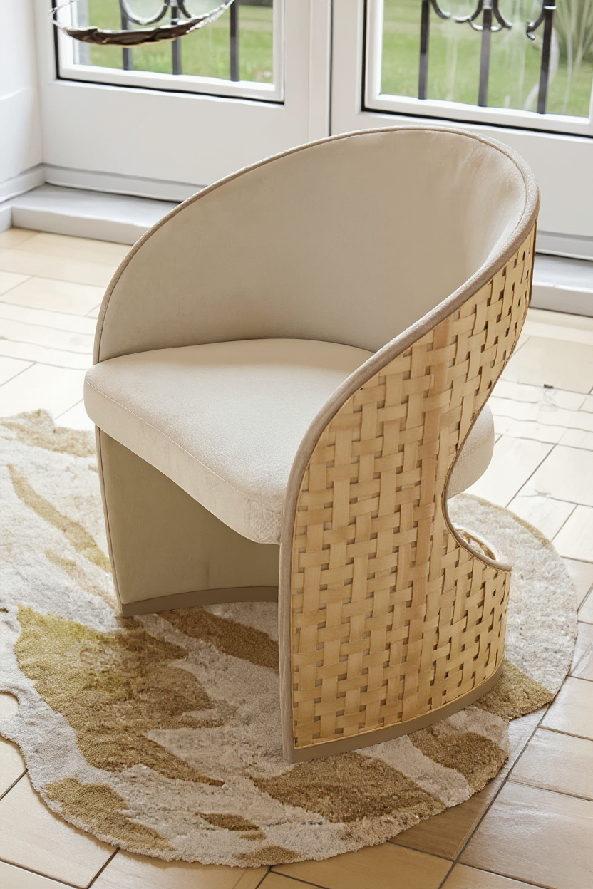 accent raffia weaving back portion upholstered with white fabric seat and back white background