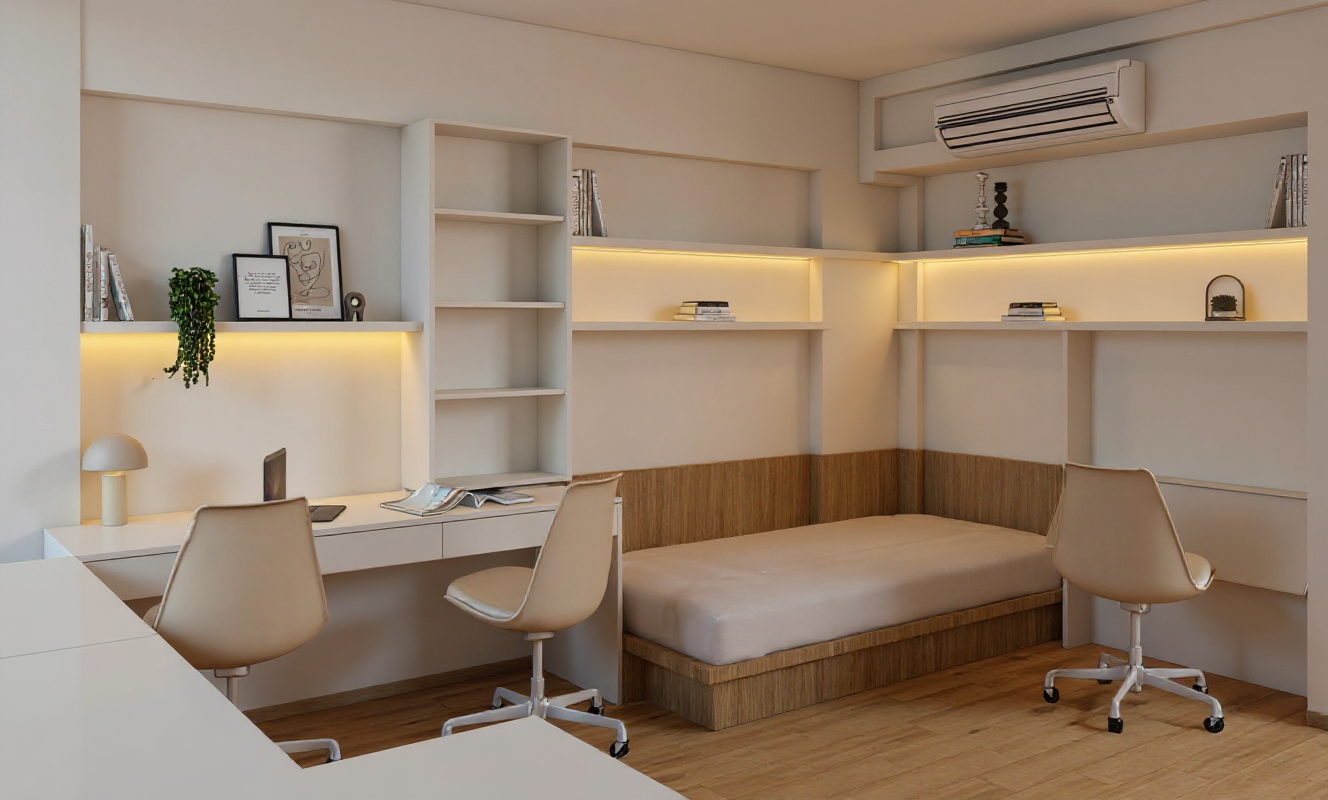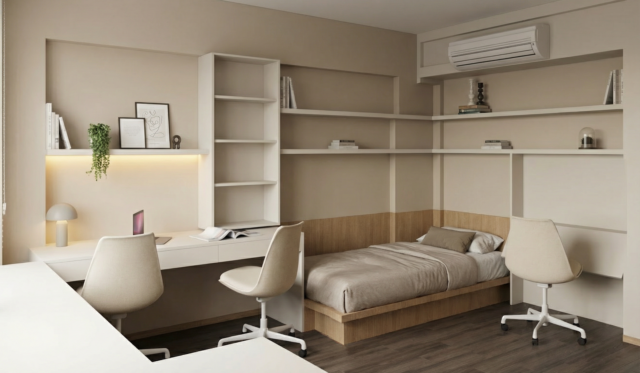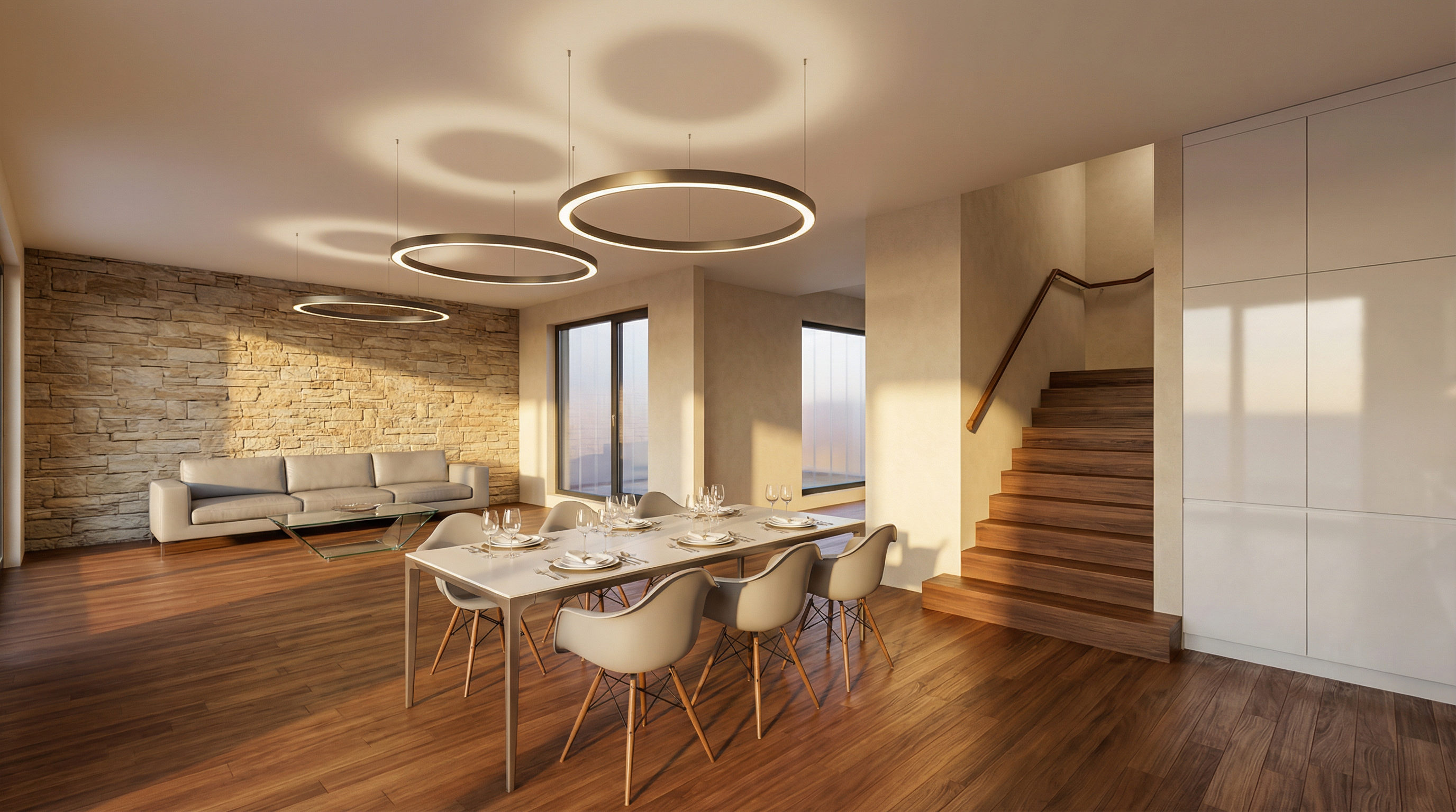 greige cabinets between big windows wall light puk from top light up and downlight