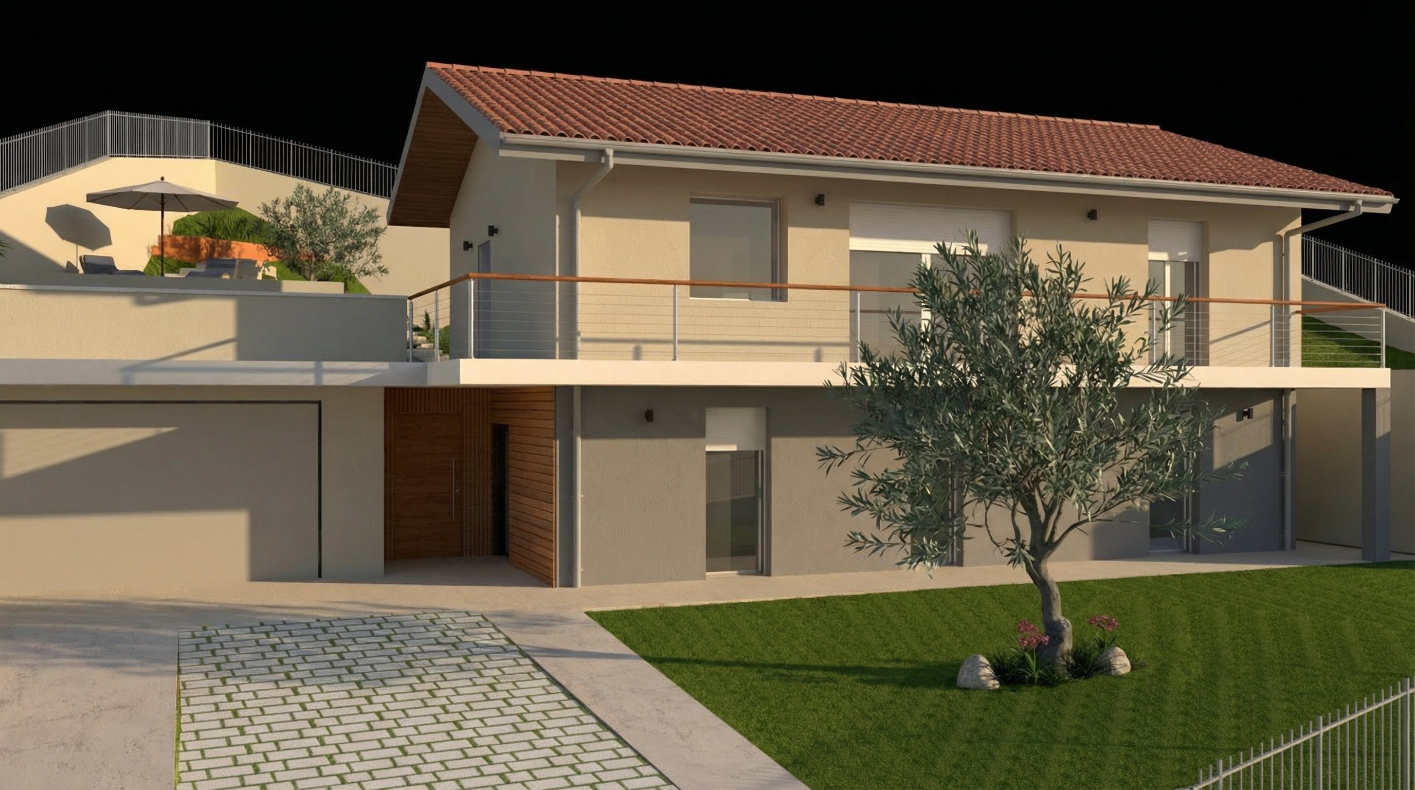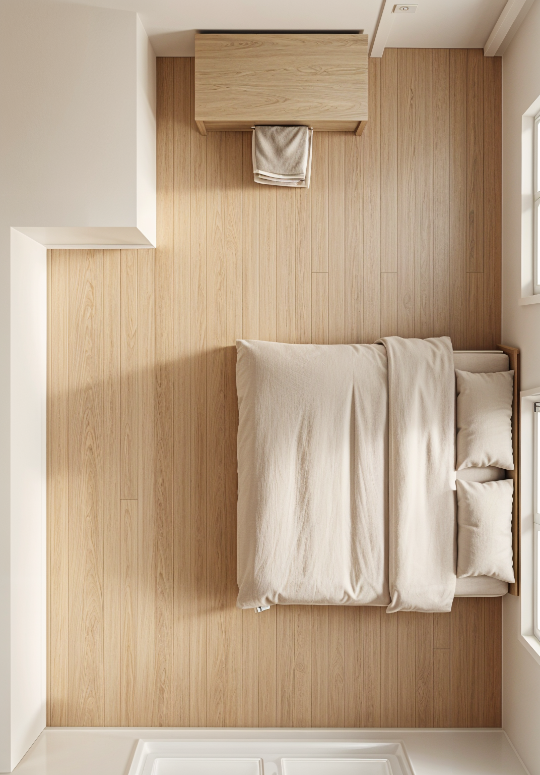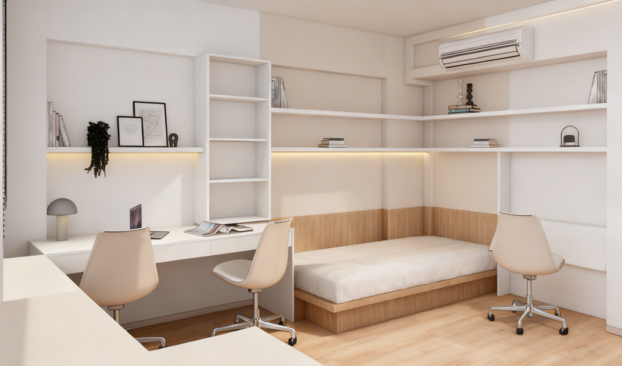 greige cabinets between big windows wall light puk from top light up and downlight