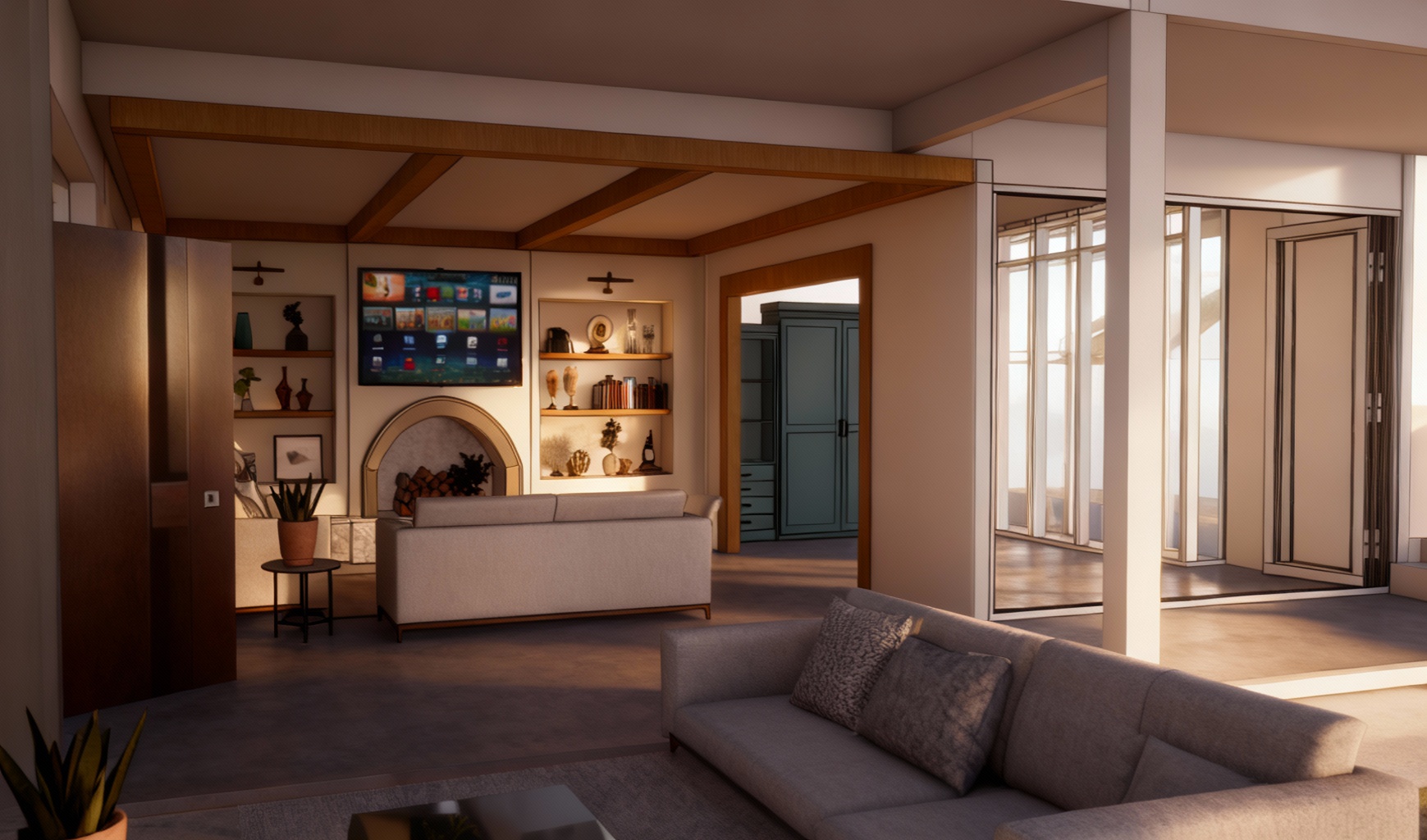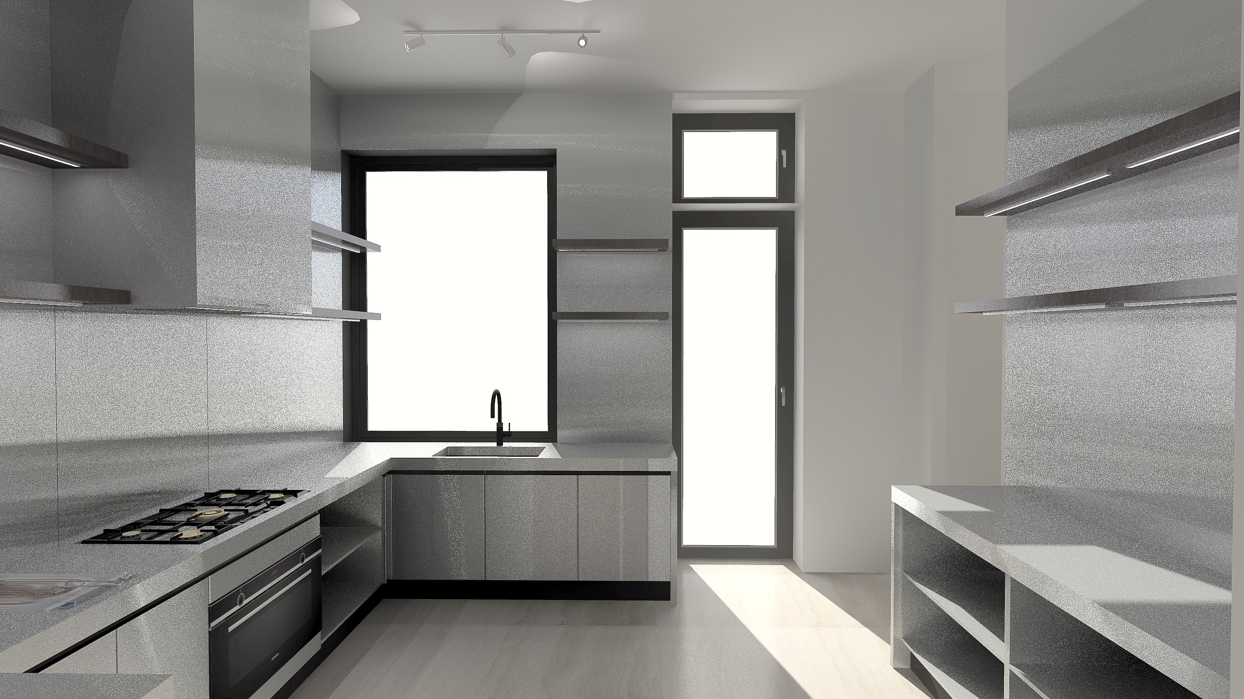 show a stainless steel cabinet and worktop effect add some under shelf and over shelf subtle led white lighting add some chopping blocks and pots and pans for decoration add some plants and herbs outside view is beautiful luxury dubai villa surrounding