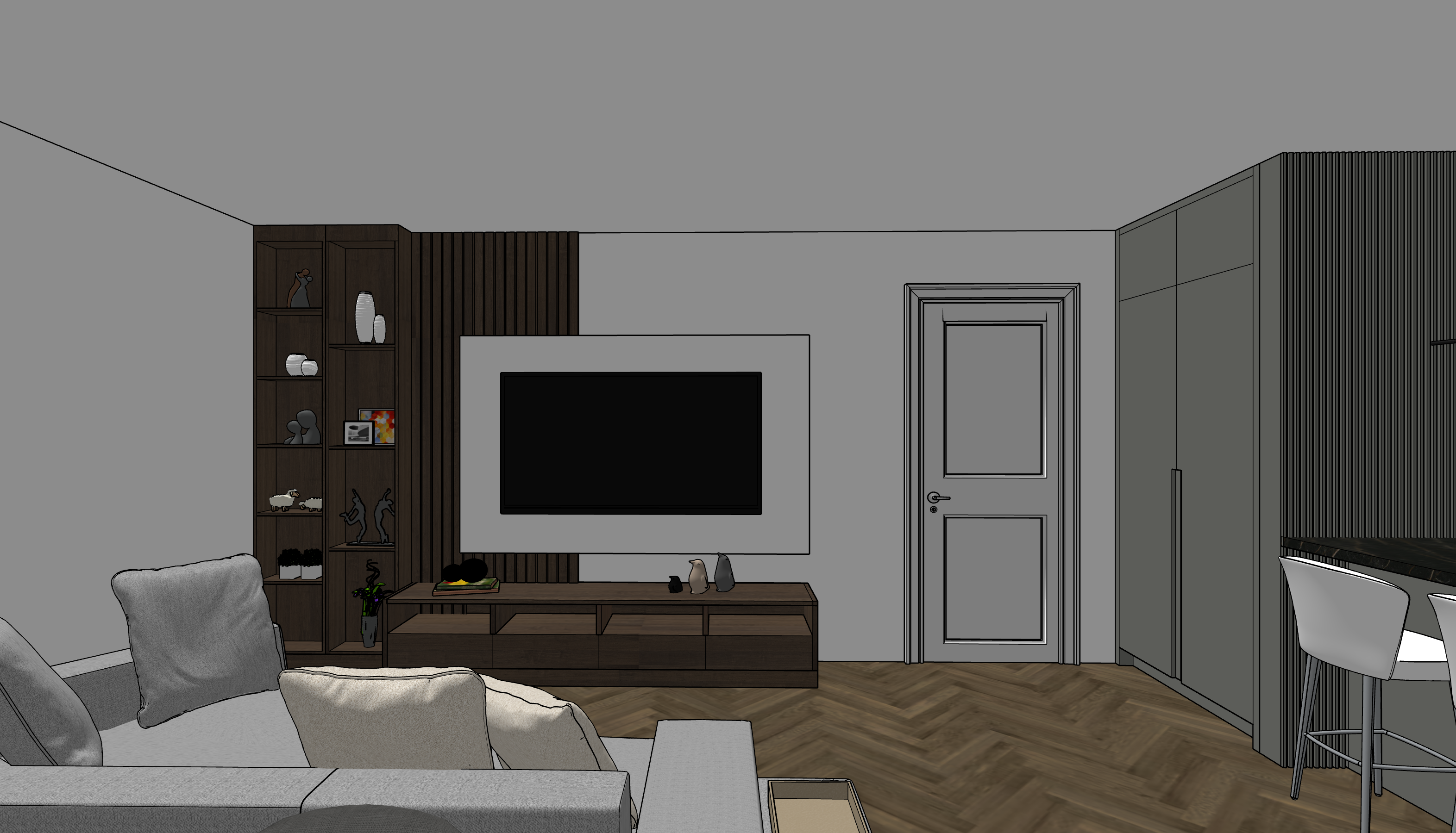 use warm grey earth tones for the wooden herringbone floors to create a cozy atmosphere incorporate dark marble countertops in the kitchen for a sleek elegant look use soft white tones for the walls to give a neutral yet sophisticated backdrop the kitchen and living area should have ample natural light to enhance the welcoming vibe all doors are white solid door no glass there is no window