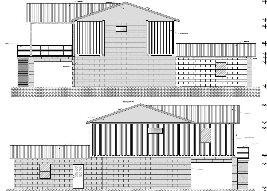 shipping container elevation drawing with a wood framed deck and staircase a modern and industrial finish with the masonry block painted white the home has a metal roof