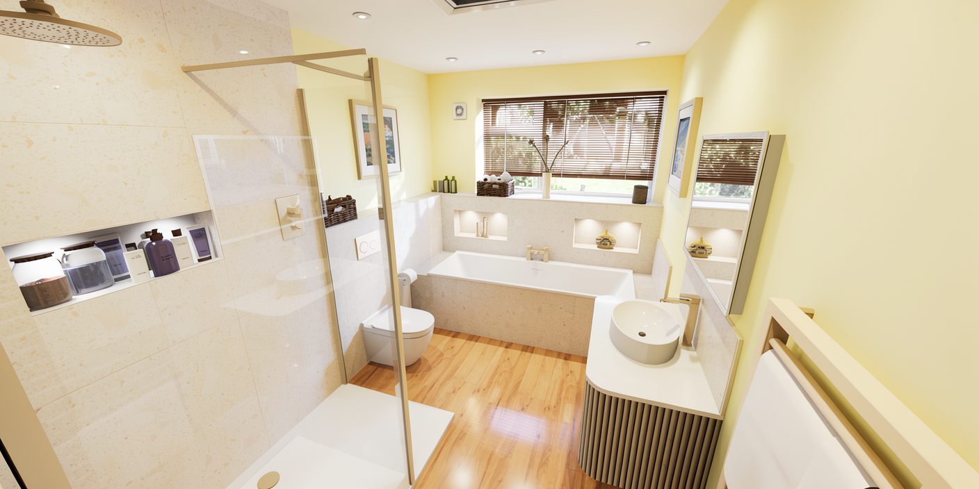 ultra realistic architectural render of an industrial public restroom interior two toilet stalls are visible through door openings framed with bright industrial yellow metal frames the surrounding wall is gray brick masonry with subtle texture and realistic mortar joints inside the stalls the partitions are concrete panels minimal and robust with visible imperfections the floor is polished concrete with a safety warning stripe running along the corridor black and yellow hazard striping painted on the floor each stall contains a matte black wall mounted toilet modern and minimal creating strong contrast with the light materials of the partitions and walls the ceiling is a black metal grid ceiling system with round recessed spotlights integrated into the grid which are the only light sources in the space lighting should be soft realistic warm yellow notes and slightly directional casting subtle shadows on the brick wall and partitions the camera view is straight on symmetrical architectural framing showing two adjacent stalls materials should feel authentic brick powder coated door frames matte black ceramic toilets raw concrete floor and partitions style contemporary industrial architecture minimal public restroom design rendering style high end architectural visualization photorealistic materials global illumination subtle ambient occlusion soft shadowing important constraints keep the original architecture and proportions do not add decorative pipes or additional elements do not change the layout