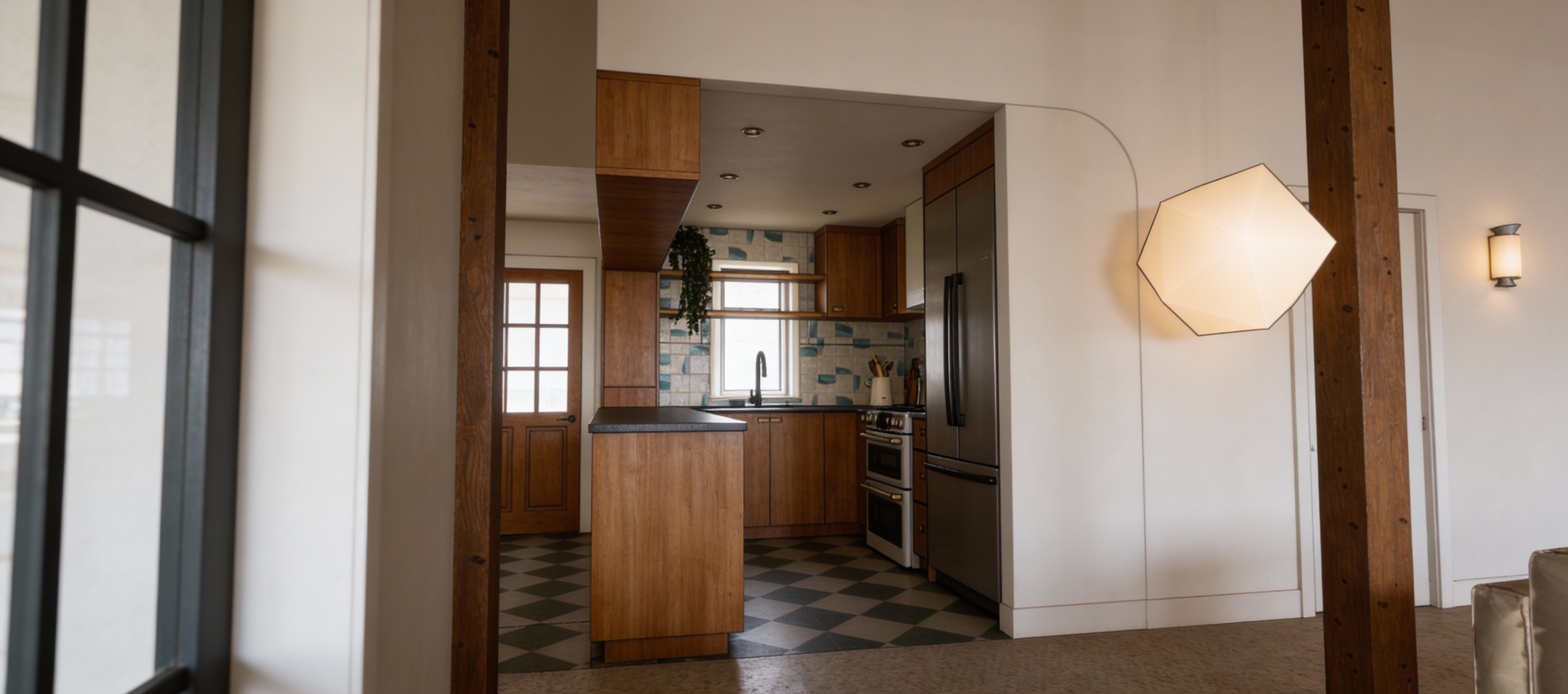 increase overall realism brighten the ceiling light fixture to make it emit stronger maintain all existing geometry and materials but enhance clarity shadows and reflections for a more realistic high quality render