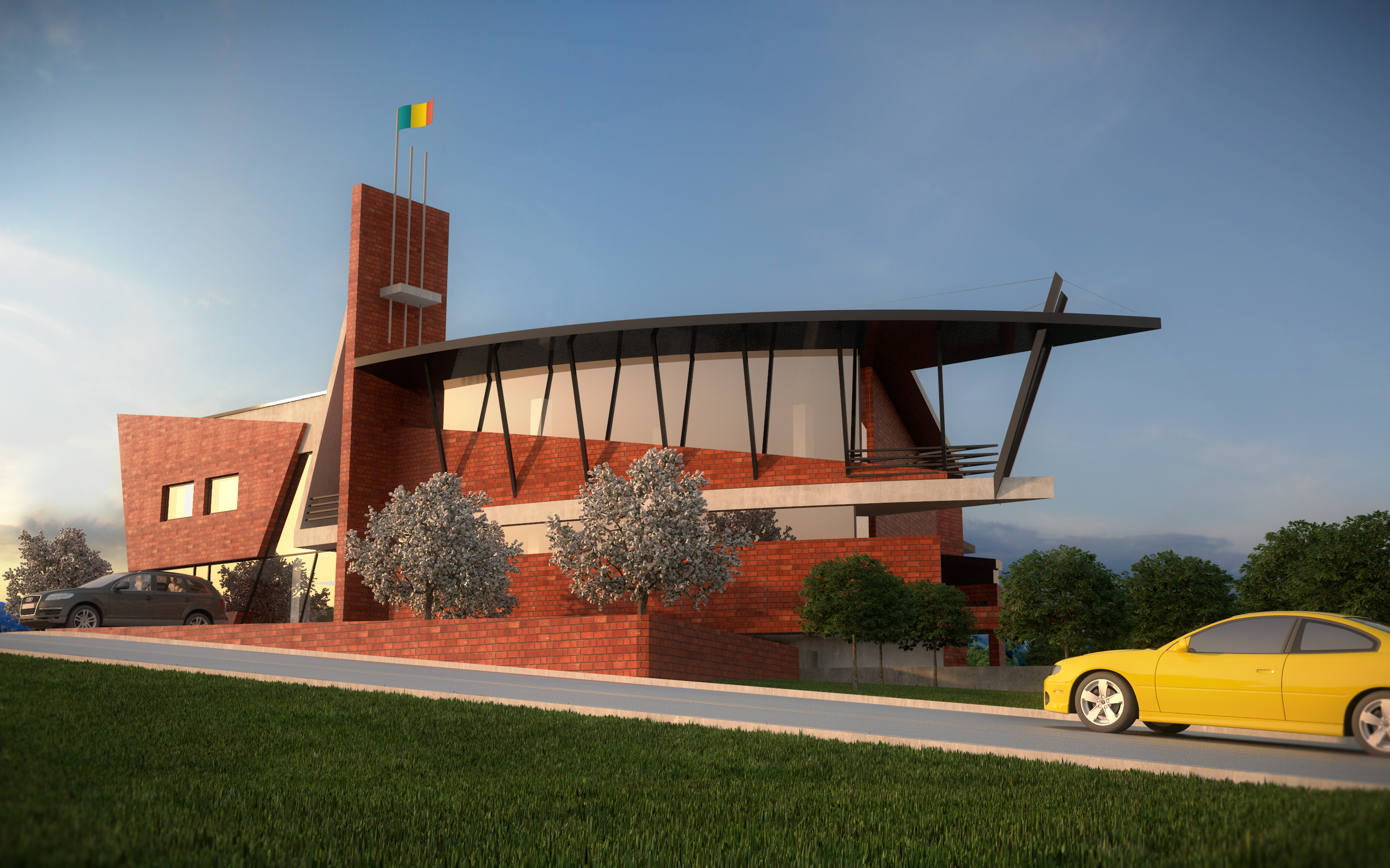 convert the image into a realistic outdoor photograph with professional architectural aesthetic maintaining 100 of the geometry and layout applying authentic materials afternoon warm lighting with soft shadows and a sharp photorealistic result add landscape design behind the building do not change material colors