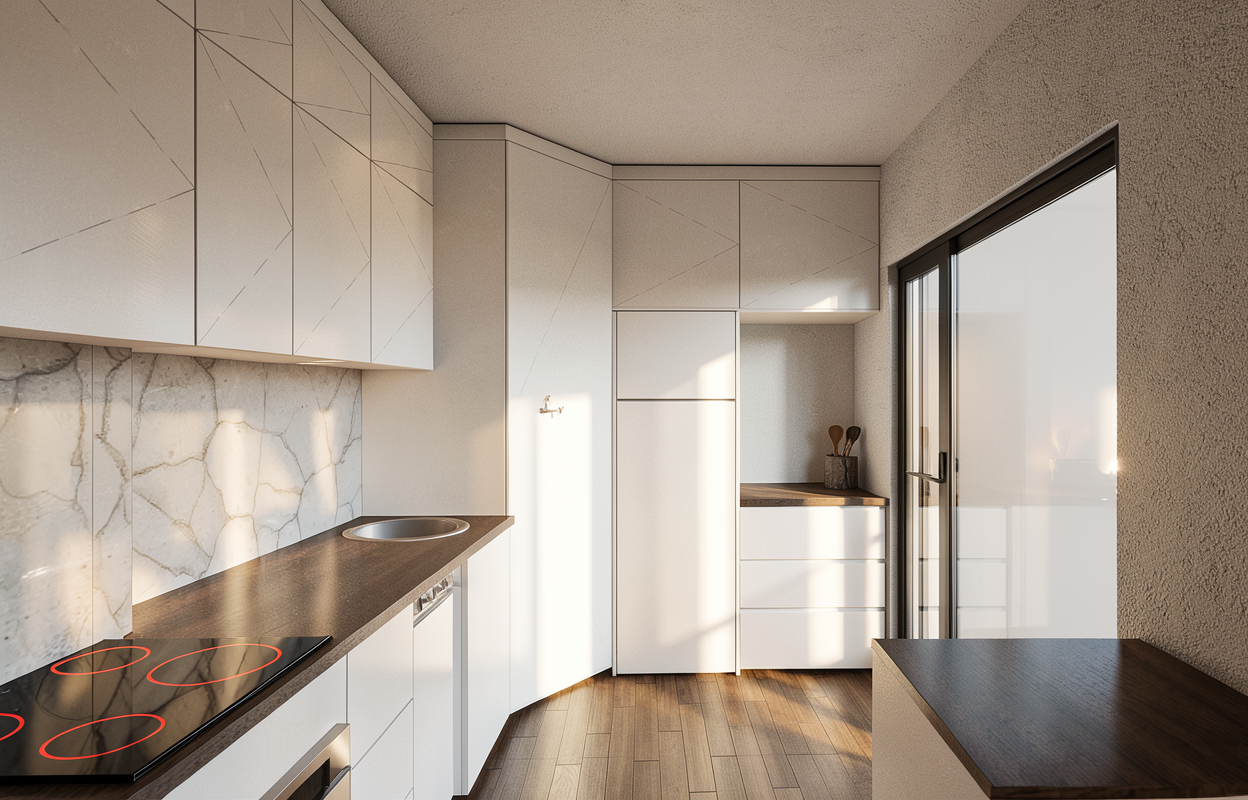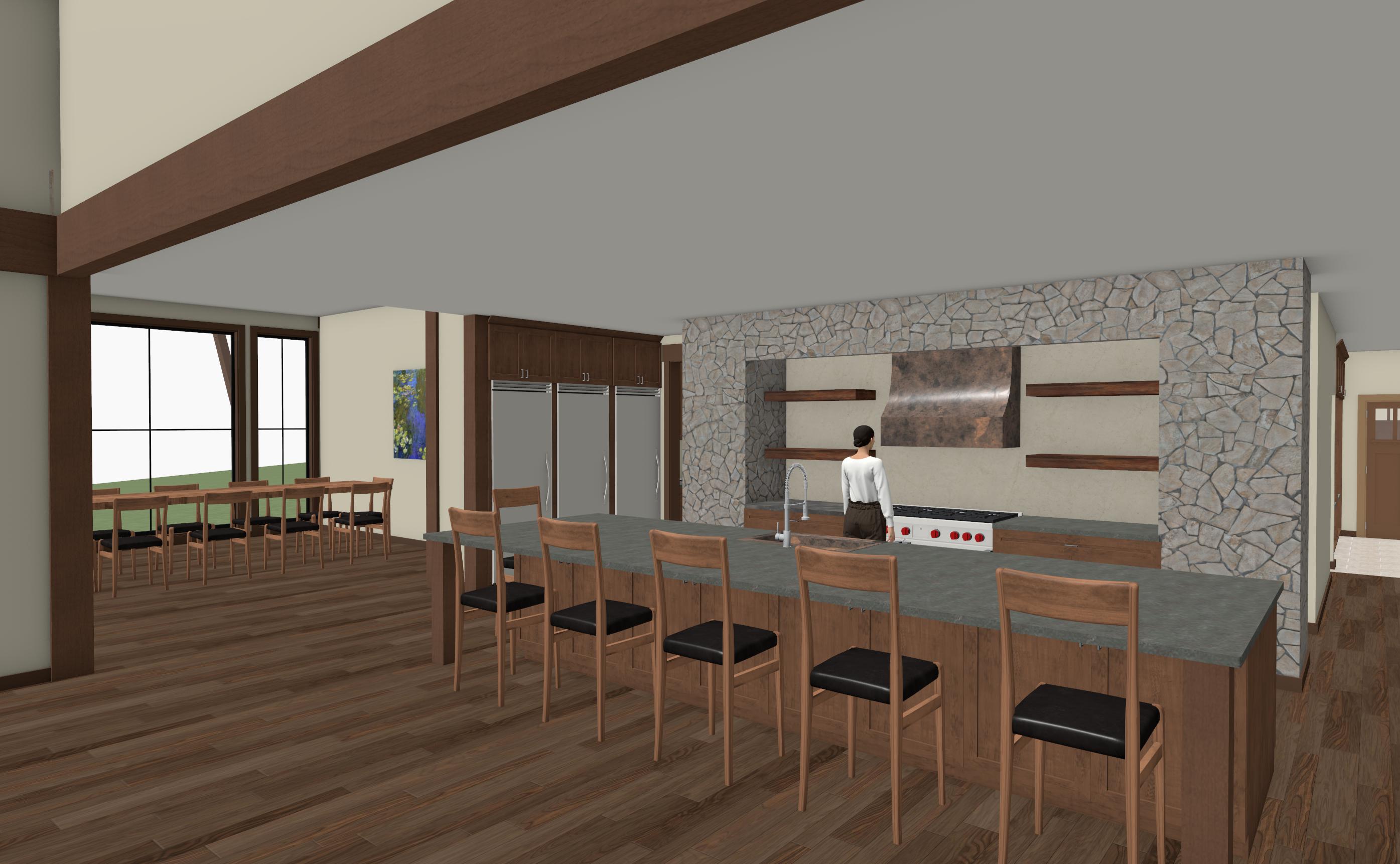 make interior look like a jackson hole interior rustic but modern add chairs at island make drywall walls and ceiling plaster it s important to keep the sizes of everything the same change textures and materials but keep the sizes of everything the same make rock realistic its important to keep to scale this room is big the person in background is 5 6 for scale do not change size of windows or doors do not add doors or windows do not change or add fixtures