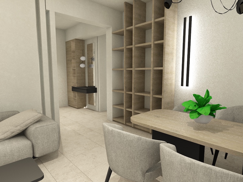 grey matt tiles on the floor 60x120 ran 9016 on the walls and white ceiling all the brown wooden elements should have the same color add decor natural light and carpet