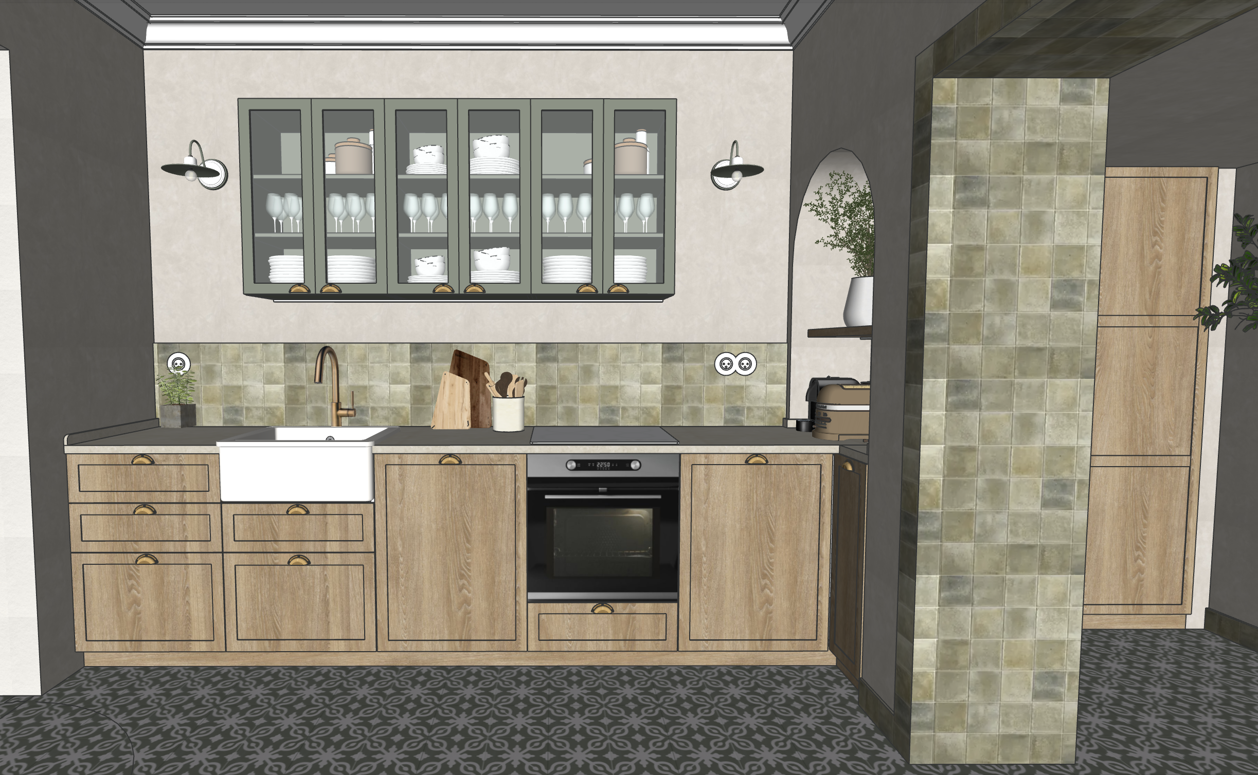 rajoute de la lumi re naturelle et de la lumi re chaleureuse dans les luminaires lumi re indirecte sous armoire vitr e au mur garde la couleur des l ments de l image le carrelage vert est leg rement brillant