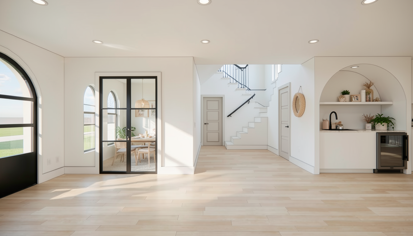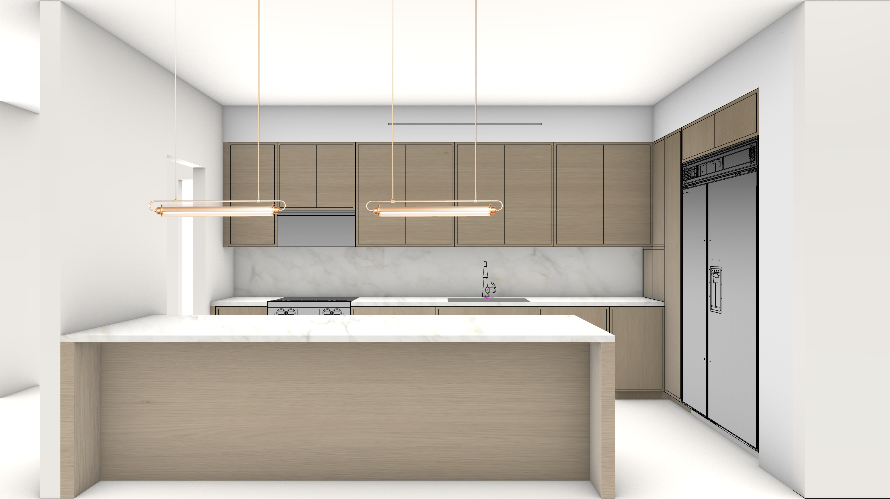 keep the exact geometry proportions camera angle composition and lighting positions exactly the same do not change any layout cabinet shape island size pendant position appliance location or perspective replace all materials with highly realistic natural textures cabinet finish light natural white oak veneer subtle grain variation soft matte finish visible pore detail slight tonal inconsistency refined contemporary millwork countertop and backsplash warm off white limestone with soft beige undertones subtle mineral variation natural porous surface honed finish seamless backsplash slab look island same limestone wrapping down as waterfall edge realistic edge shadowing and surface micro imperfections walls soft warm white plaster subtle texture matte natural light falloff metal accents brushed warm brass pendant lights realistic metal reflection slight patina variation soft glow filament detail appliances high end built in refrigerator with stainless steel realistic brushed texture subtle fingerprint diffusion lighting soft natural daylight from left side gentle ambient bounce realistic global illumination subtle shadows no harsh hdr rendering style ultra photorealistic architectural photography 85mm lens shallow natural contrast warm neutral color grading high dynamic range refined editorial interior shoot quality avoid no redesign no new elements no modernizing shapes no extra decor no color shift in layout only upgrade material realism and lighting realism add micro surface imperfections subtle edge wear realistic shadow gradients slight material roughness variation high resolution pbr texture detail