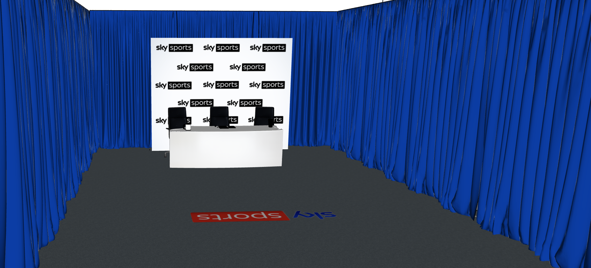 the space should be lit like a tv studio and not too organge remove all plants do not light the back screen too much make the floor a grey lino with some texture do not cut out the sticker on the floor that says sky sports add two bands of silver panels to the front of the desk