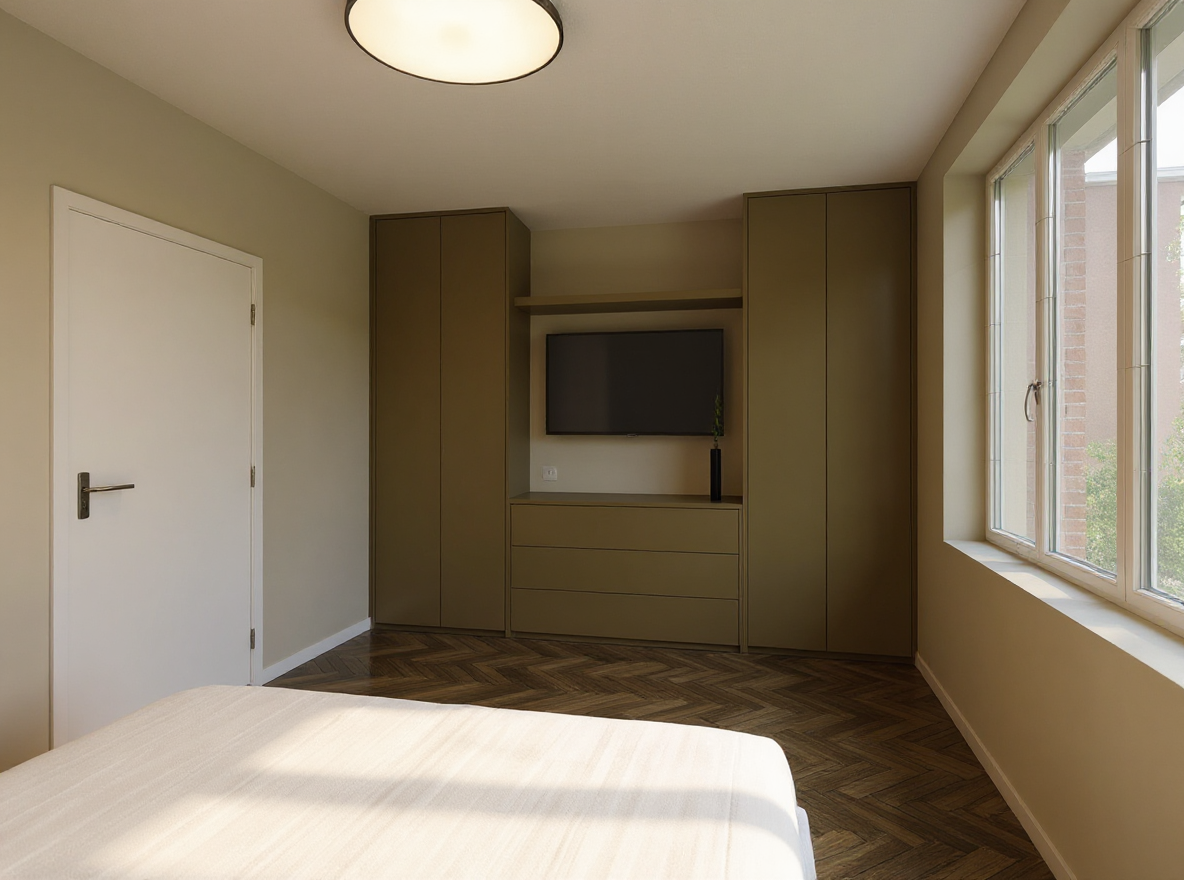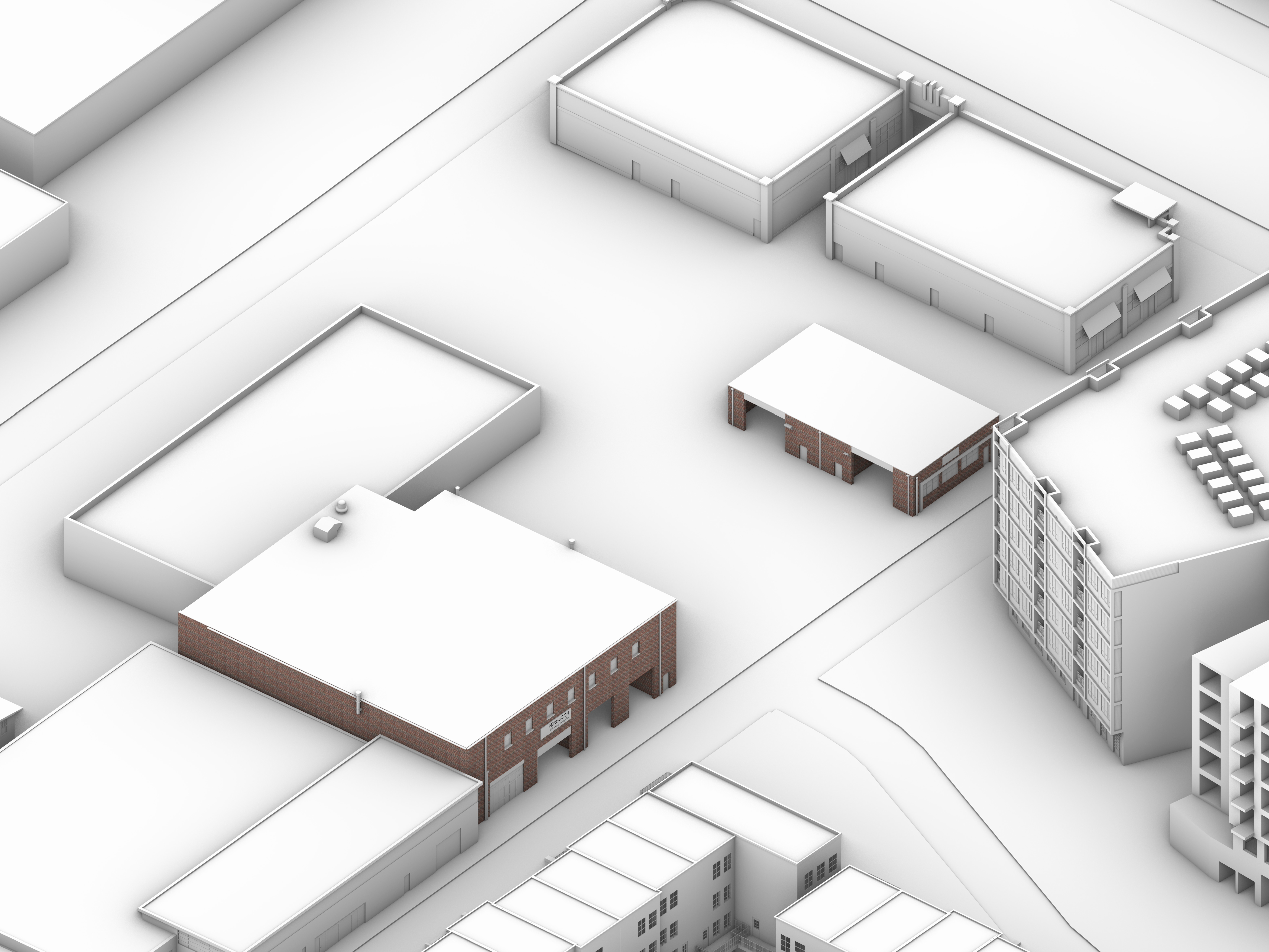 maintain the exact camera angle geometry and site model do not alter any building forms except the smaller highlighted building overlay a mid demolition scene only on that smaller structure partially removed roof exposed steel framing and dismantled brick fa ade add organized piles of salvaged brick stacks and bundled steel beams near the building as if kept for reuse include a small crane or excavator actively lifting material only from this building temporary fencing around it debris netting and dust localized to that zone keep all other structures untouched and clean lighting should remain neutral and match the original clay aesthetic the demolition must read as selective and intentional showcasing material recovery rather than destruction