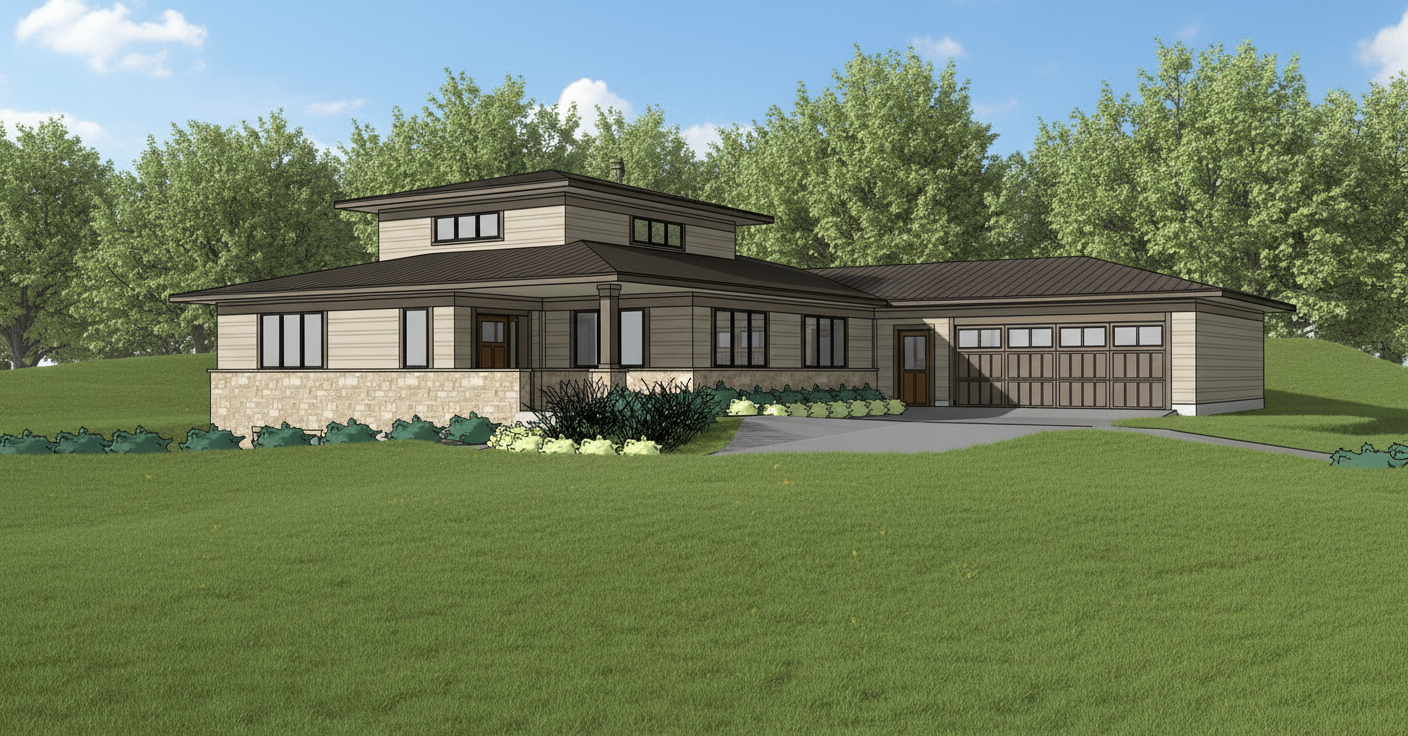 make this look photo realistic smooth out the topography show real plants in the foreground and some trees in the background stay true to the building geometry window placement etc