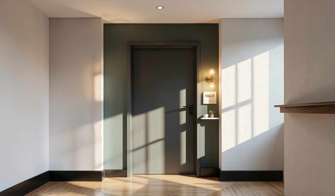 make this photo realistic and ensure the back wall behind the desk is white and the thin framed inside is a bronze mirror make this space brighter with daylight