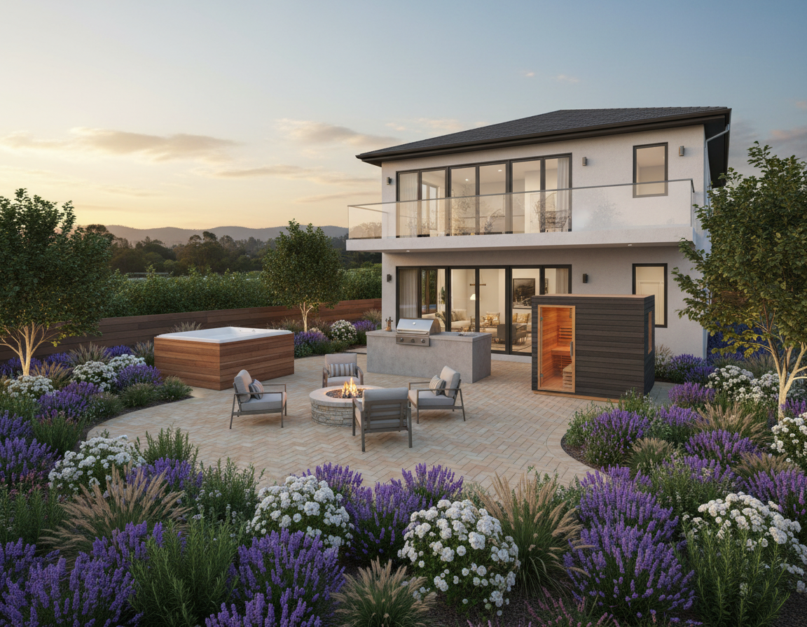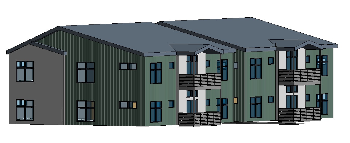 modern agrarian apartment building with stucco and vertical gray green metal siding black windows black metal railing stained cedar accents modern layered california planting