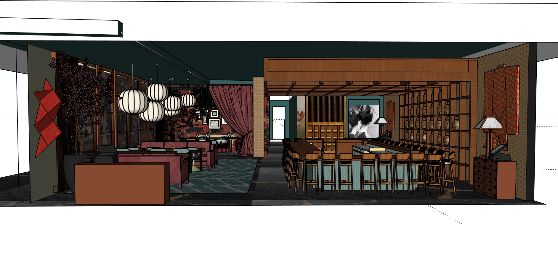 overal ambiance light ad rolls of burfundy fringes on top of bar area