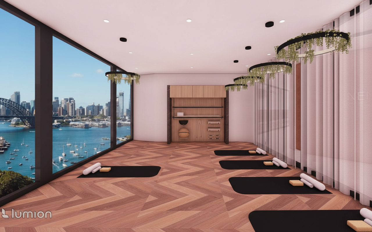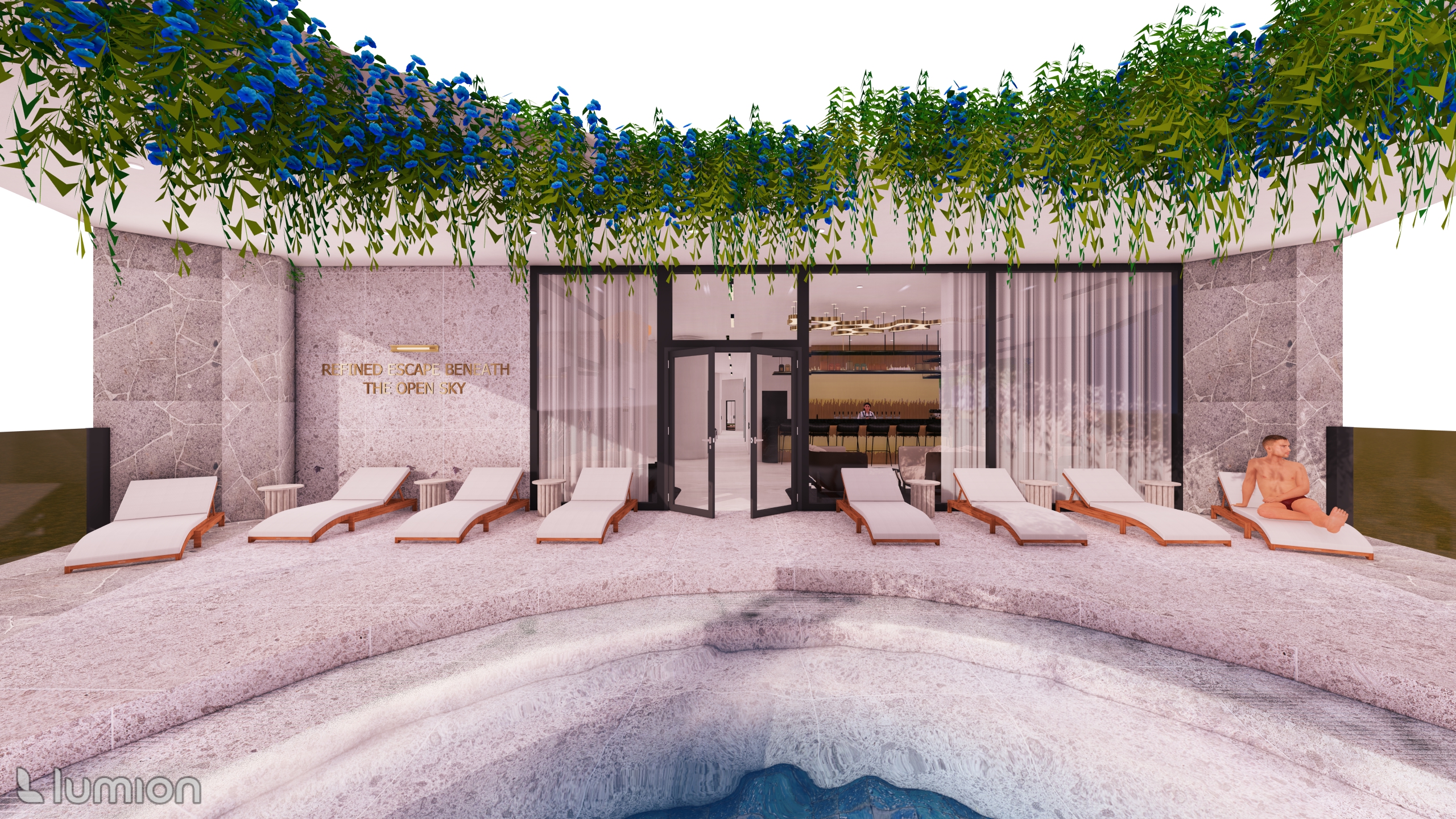 a serene luxury poolside lounge area designed with curved stone terraces leading down into a shimmering blue plunge pool elegant reclining sun loungers with timber frames and soft white cushions are arranged along the terrace with one person relaxing on a lounger to bring life to the scene the fa ade behind features textured grey stone walls sheer full height curtains and glass double doors opening into an interior lounge and bar area above lush cascading greenery with vibrant blue flowers drapes from the roofline adding a rich biophilic touch a gold wall feature displays the words refined escape beneath the open sky reinforcing the tranquil resort atmosphere in the distance beyond the terrace the view opens to a panoramic sydney skyline with clear skies and soft daylight illuminating the city s silhouette the overall mood is calm luxurious and resort like rendered in a high end lumion visual style