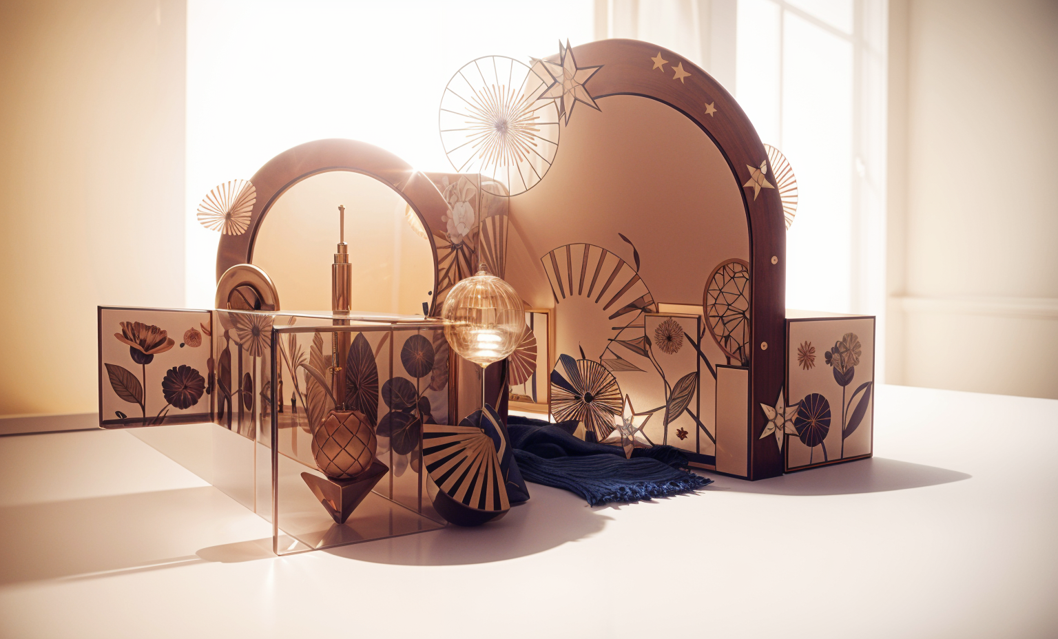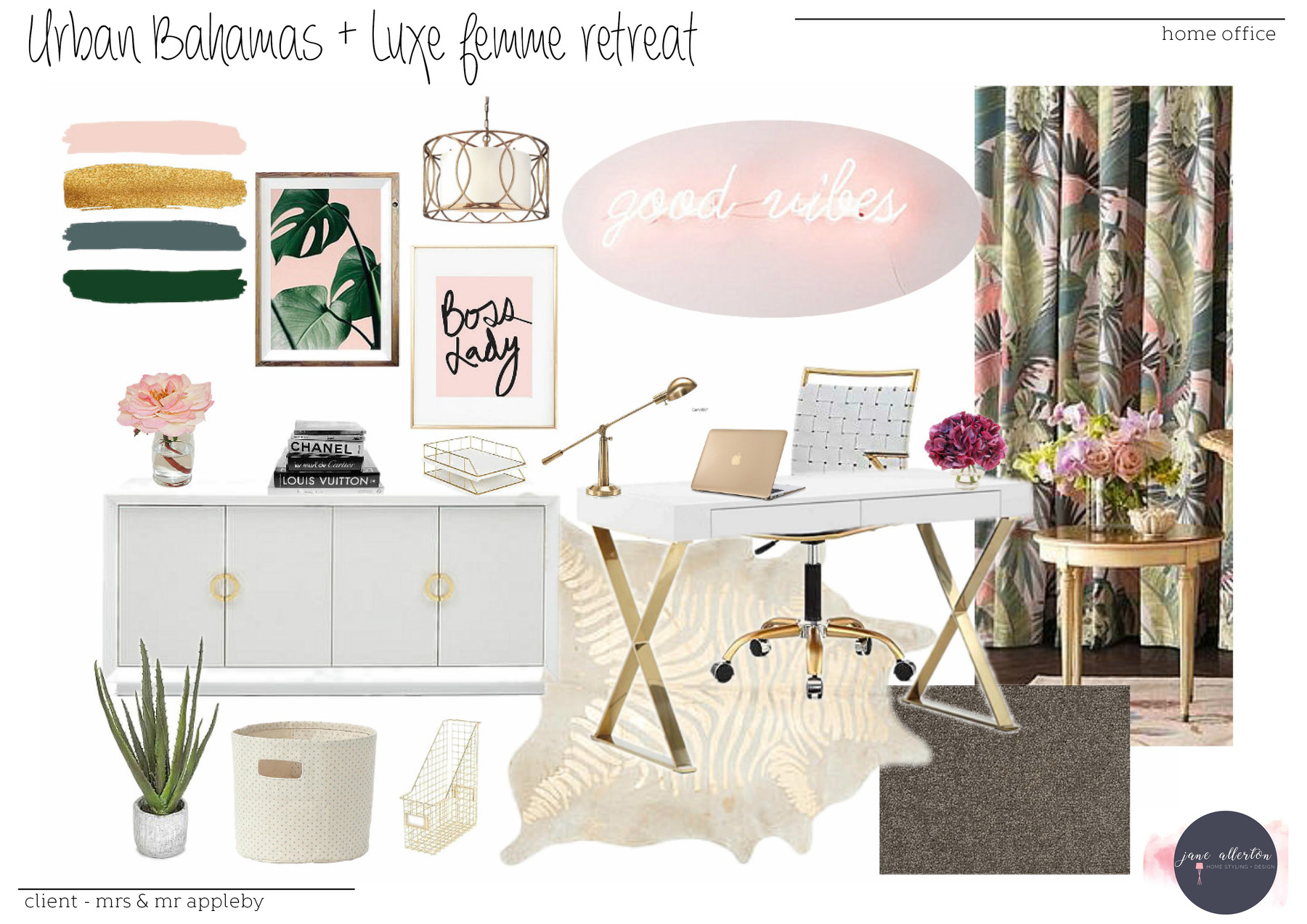 a glamourous barbie style office with sparkly things and lots of light pink gold and animal print and florals