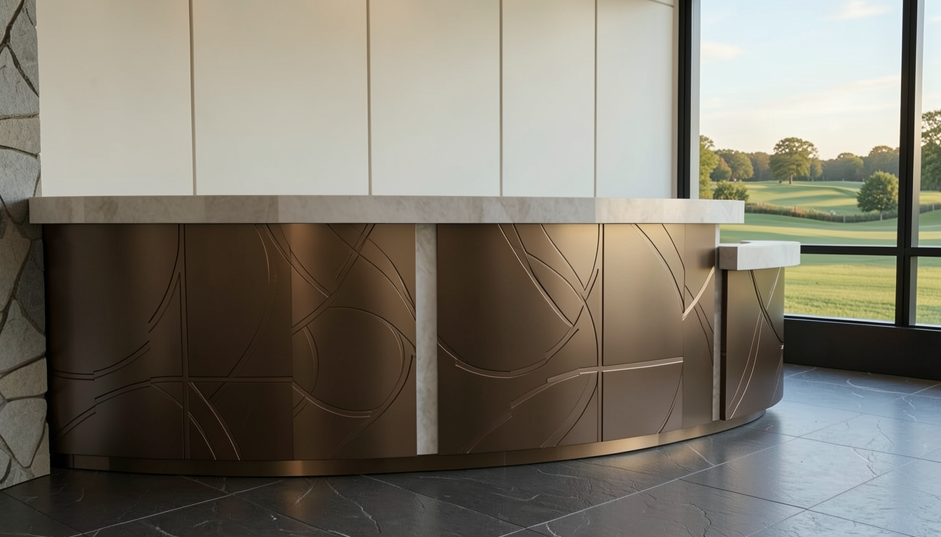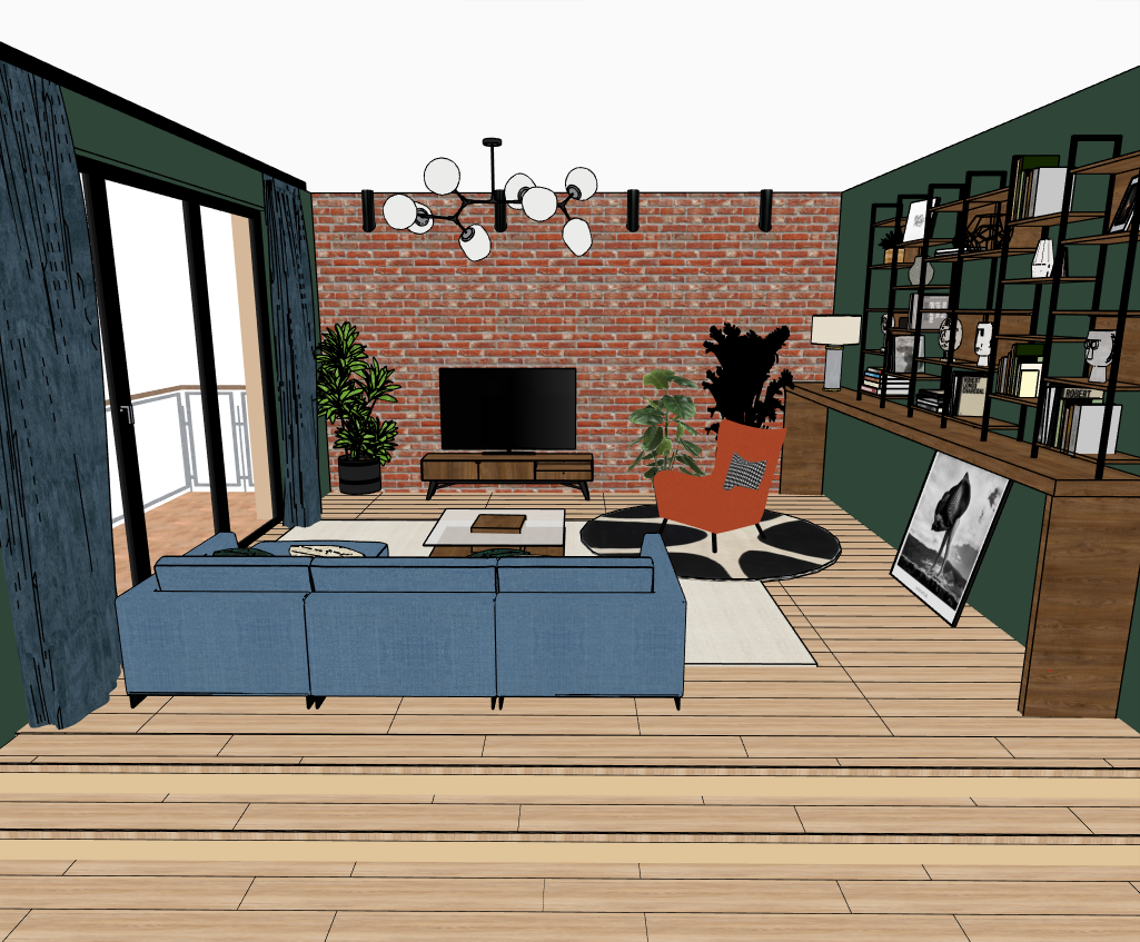 create a soft loft atmosphere the wall is dark green ral6005 the parquet is oak colored with striped offset tiles add a nice texture to it opposite is a brick wall with a tv on it the sofa is blue in front of it is a thin structured beige carpet the armchair is a terracotta colored comfortable winged armchair under the armchair is a black and white round rug in the armchair is a black and white pillow to the right behind the armchair the shelves are walnut colored with books vases and small statues on the shelf an led strip lights up under the long shelf brightening the picture tilted against the wall a lamp lights up at the end of the long shelf above the armchair an led strip also lights up under the two steps the curtains are dark blue through the windows we can see a big city the spot lights beautifully illuminate the wall the picture has a soft bright cozy light show everything where it is in the picture