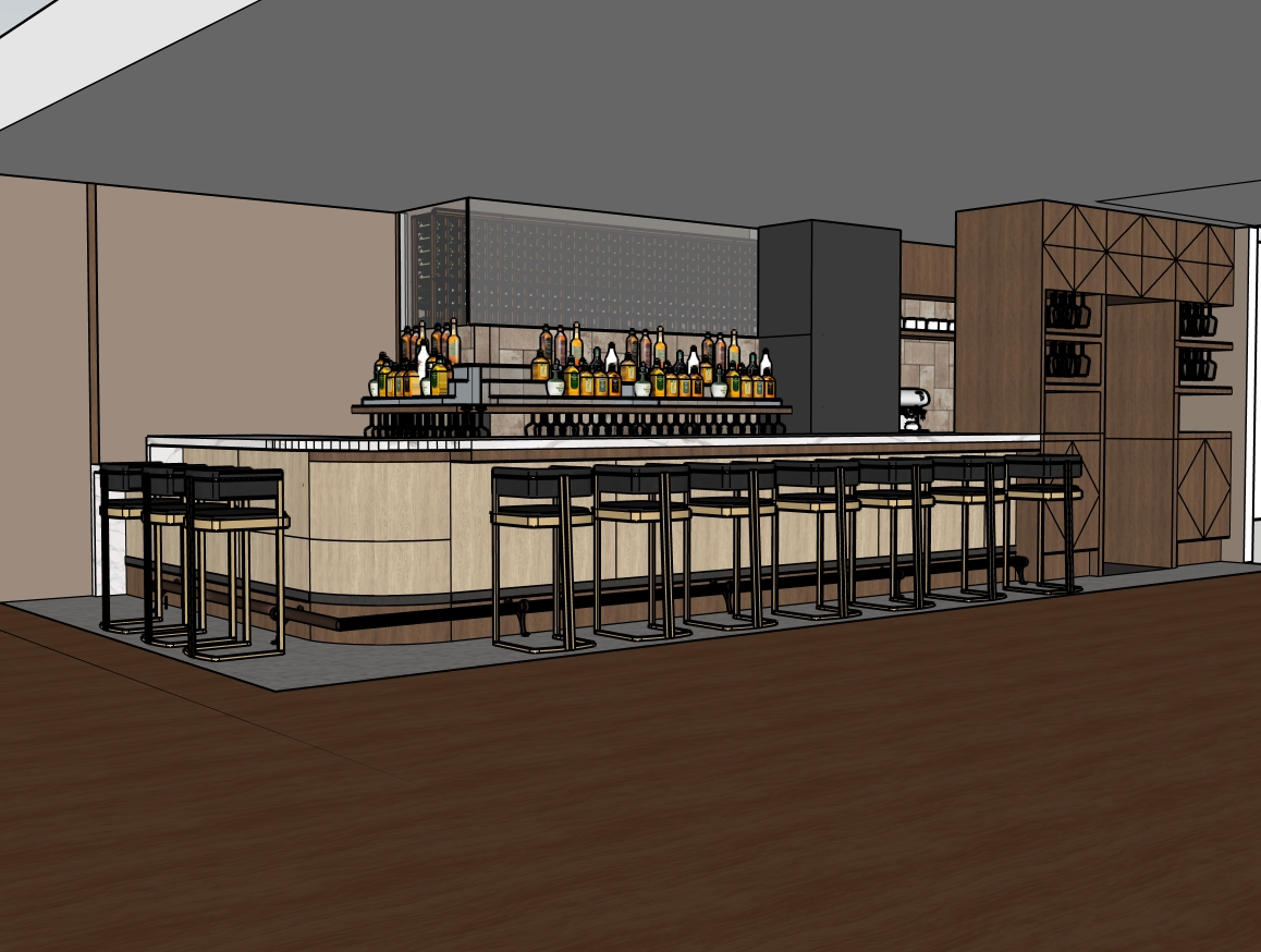 fluted ridged bar front in light natural wood dark wood foot base with foot rail at the bar glass to see wine bottles behind the glass