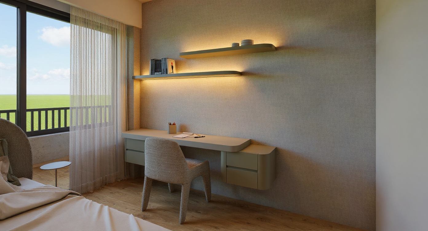 render a modern house with a red tile roof and white walls the roof features a sleek gray pergola the building stands on a lush green lawn with a brick sidewalk the sky is clear and blue creating a serene and inviting atmosphere use vibrant realistic colors to make the scene come alive with detail and warmth trees and bushes on the perimeter few small house on the background
