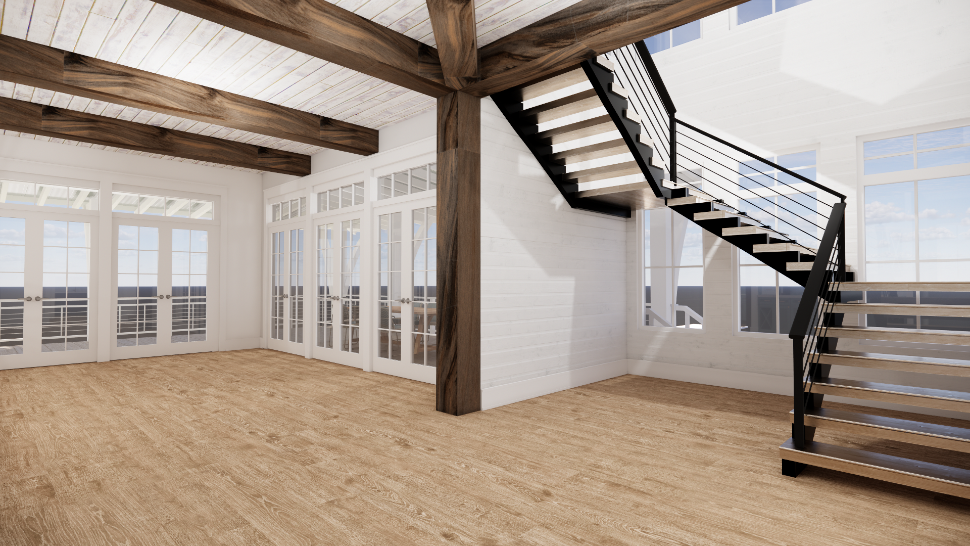 you are a professional image renderer you create the highest grade renderings around and specialize in architectural renderings this is an interior rendering of the stairs of a beach house create a high resolution photorealistic image of this room keep the windows as they are where they are keep the doors as they are where they are keep the main structure as it is where it is feel free to change the perspective keep the ceiling as it is where is it do not add anything to the structure that i have not asked for you can see the beach out the windows