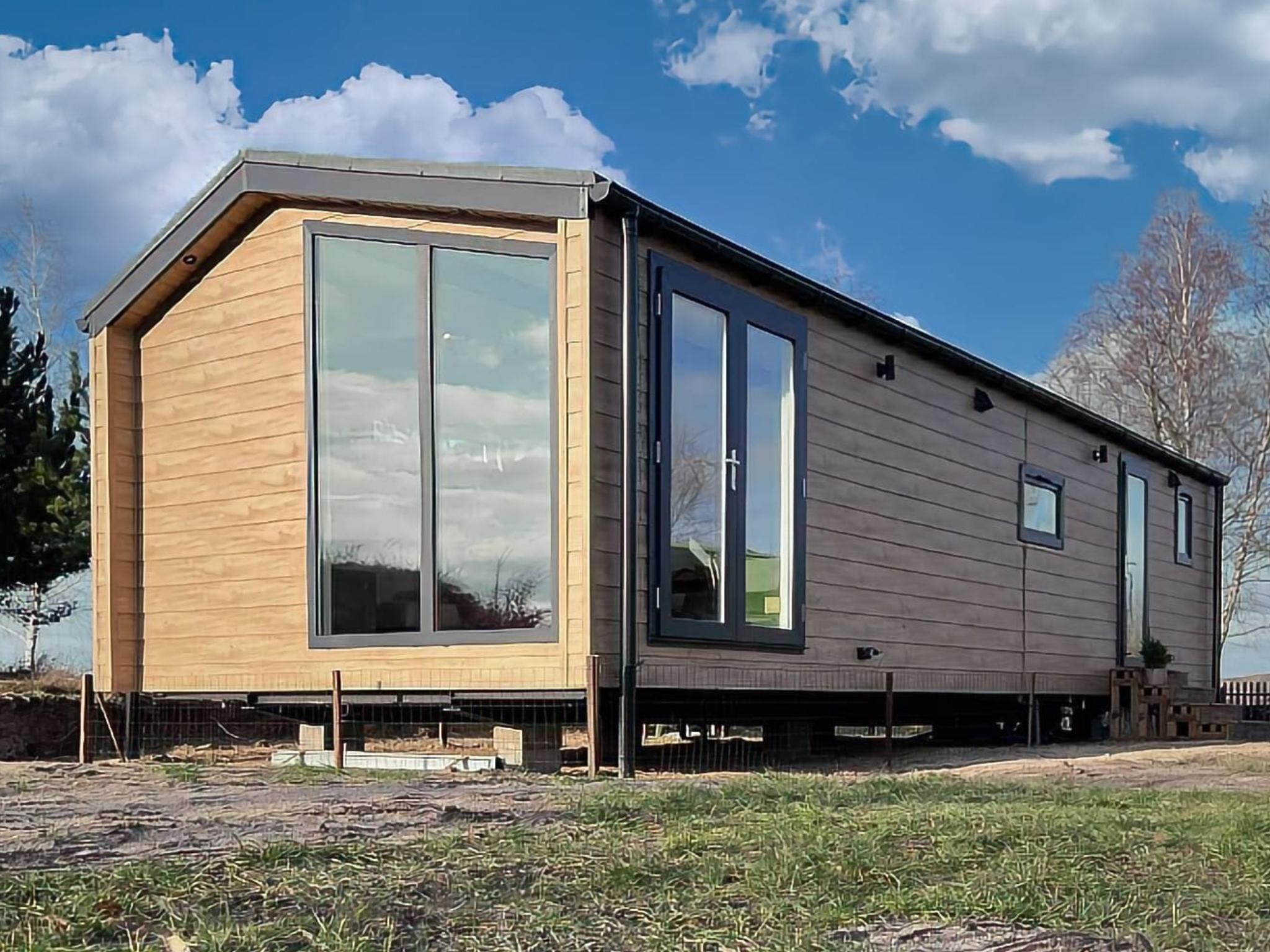 create a natural visualisation of the house based on the attached photo keep the fa ade colour identical preserve the exact roof shape and do not change the layout of the windows doors or any architectural elements the building proportions must remain unchanged remove the visible wheels under the house the house should be placed directly on paving stones surround the house only with flat green grass no trees shrubs fences garden furniture or any additional environmental elements camera positioned above the house top down elevated view angled slightly downward to show the roof and part of the fa ade focal length 35 45 mm natural daylight blue sky soft shadows clean minimalist architectural visualisation style
