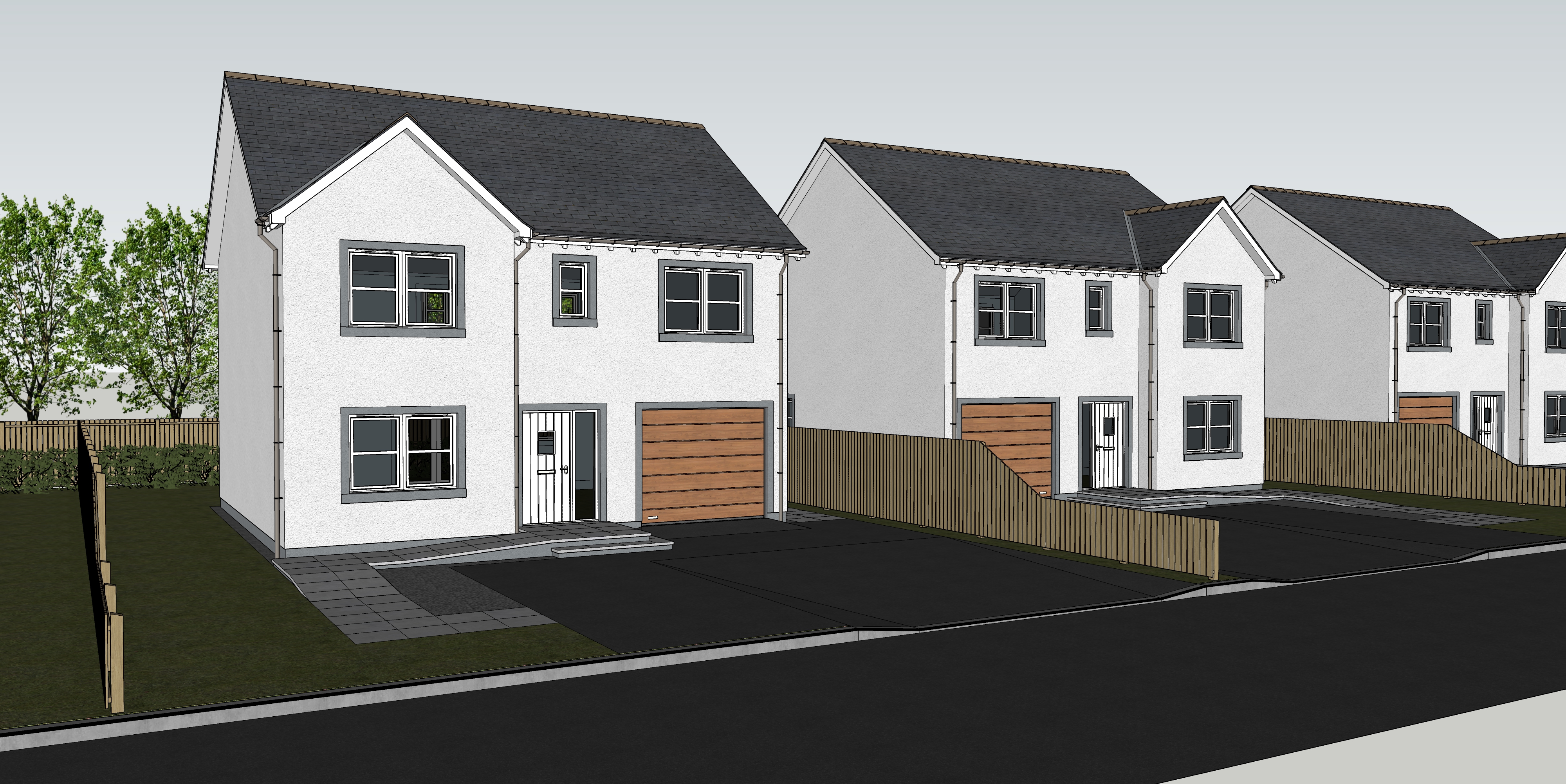 create a photo realistic render of this image keeping the same colours and features but with some soft landscaping to the garden and a family car on the driveway