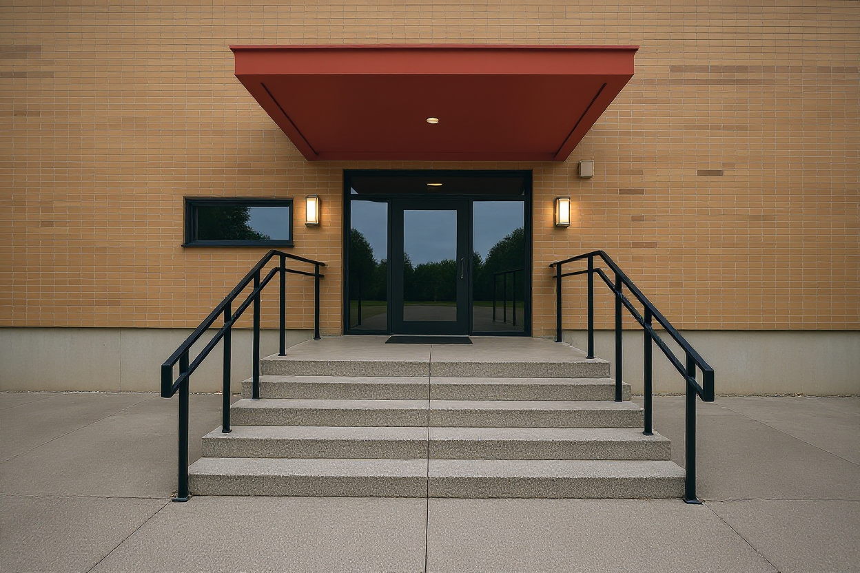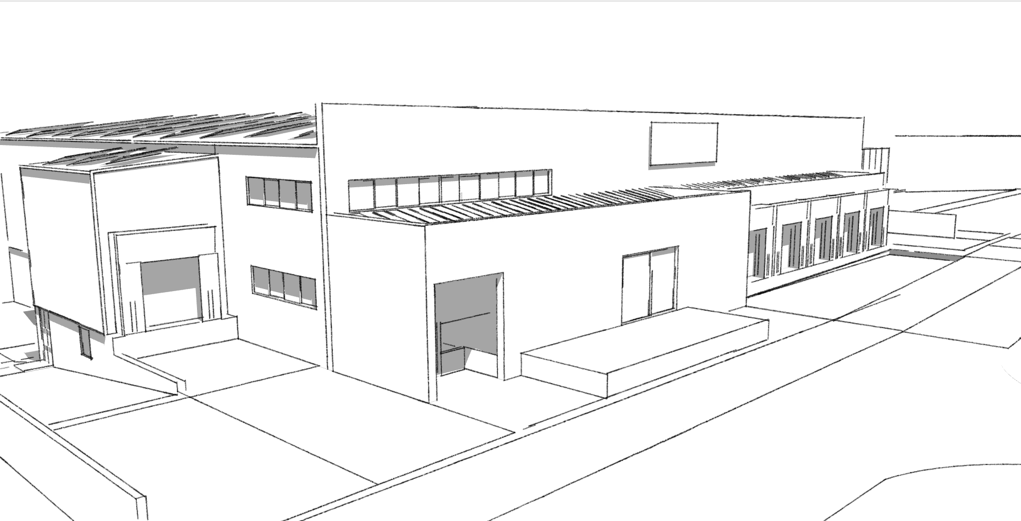 modern industrial building with a clean minimalist design white metal composite panels on the fa ade large reflective blue tinted glass curtain wall at the main entrance and sharp geometric volumes forming a cantilevered upper block long side elevation with continuous opaque white cladding and a distinctive diagonal cut window band clear precise edges and monolithic appearance exterior ground composed of asphalt on the left and white gravel garden with small shrubs and a sculptural olive tree on the right bright daytime sky with soft shadows maintain the perspective geometry scale and proportions of the original reference photo high realism but sketched architectural rendering style