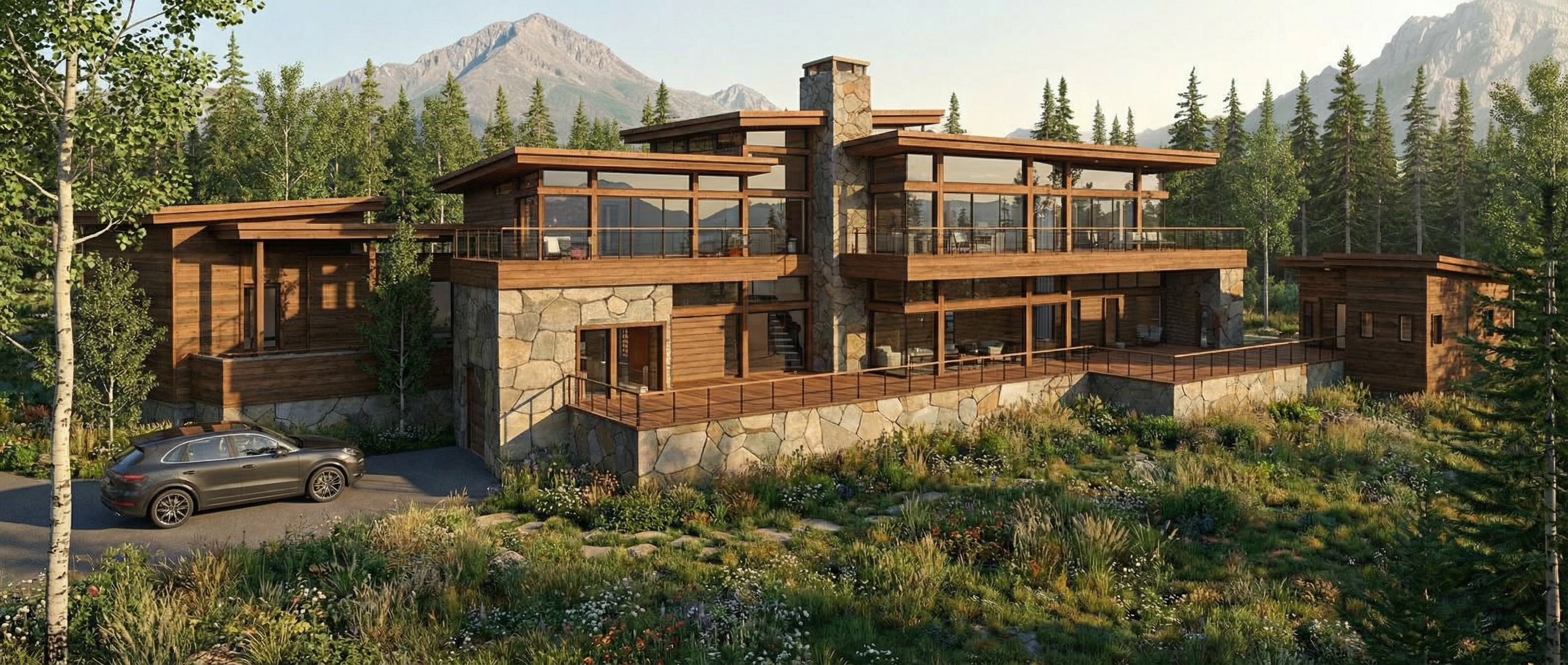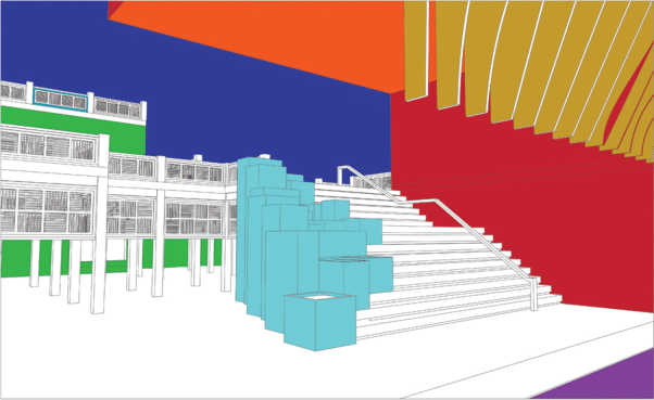 render this to a realistic quality using material pallets such as concrete wood stone all that any cyan colors should be rendered as a concrete based planters that sit staggered on the main staircase they are made from concrete and shouldnt be blue any red should be a darker staggered stone texture the yellow should be the wooden facade panels the orange is roof underneath a large cantilever add rigid simple lights underneath that illuminate the stairs the dark blue should be rendered as sky do not add objects just render the dark blue color as the sky and sky only the green should be rendered as staggered stone walls in the background render the plaza structure as wood too and add lighting behind it so the plaza space does not look so dark but keep in mind the green stone walls that are behind it