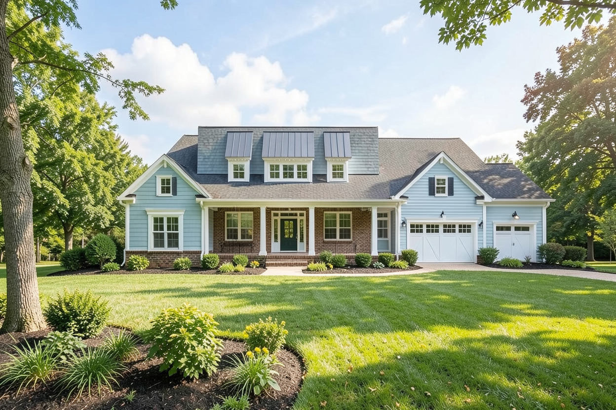 professional landscaping lake house scenery light blue siding light brown brick white windows white trim white gutters white fascia white porch post