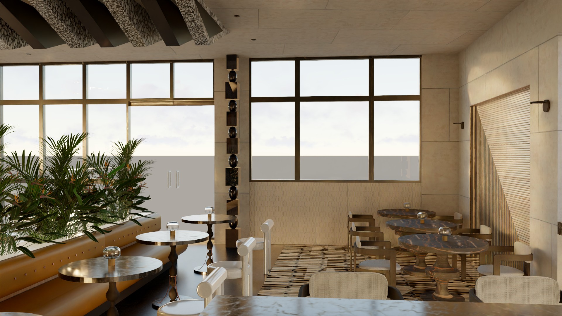 add an outdoor patio outside the window change the white chairs to be white wool enhance realism add under glow and slight illumination from downlights