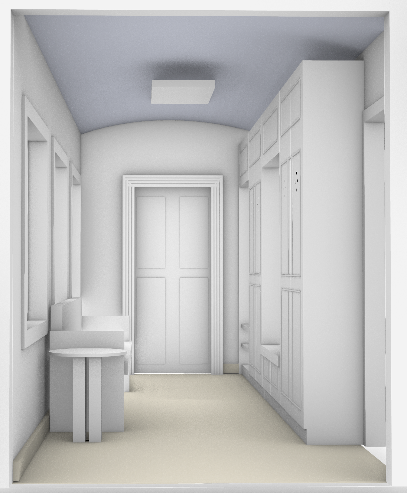 render this with a romantic morning light on it keep all the walls ceiling and storage a warm off white except the floor can be an outdoor brown quarry tile the door is a craftsman paneled door in a perriwinkle blue tone with a bronze handle and a black door frame make the bench on the left a oak antique church pew and side table and add vase of lavender flowers the window casements and mullions can be a dark stained warm oak