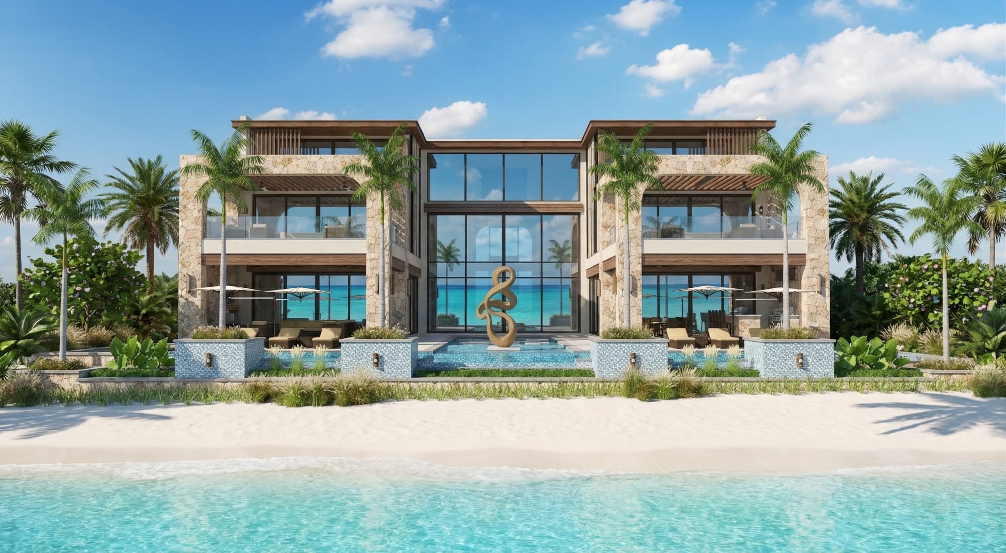 tropical luxury beachfront villa with a modern architectural design featuring large glass windows and stone walls the villa is surrounded by lush green palm trees and vibrant tropical plants elegant pools with intricate blue mosaic tiles surround a contemporary abstract sculpture the pristine beach has soft white sand leading to the crystal clear turquoise ocean the sky is a clear blue with a few fluffy white clouds creating a serene and inviting atmosphere use warm earthy tones for the villa s structure and rich greens for the vegetation complemented by the vivid blues of the water and sky