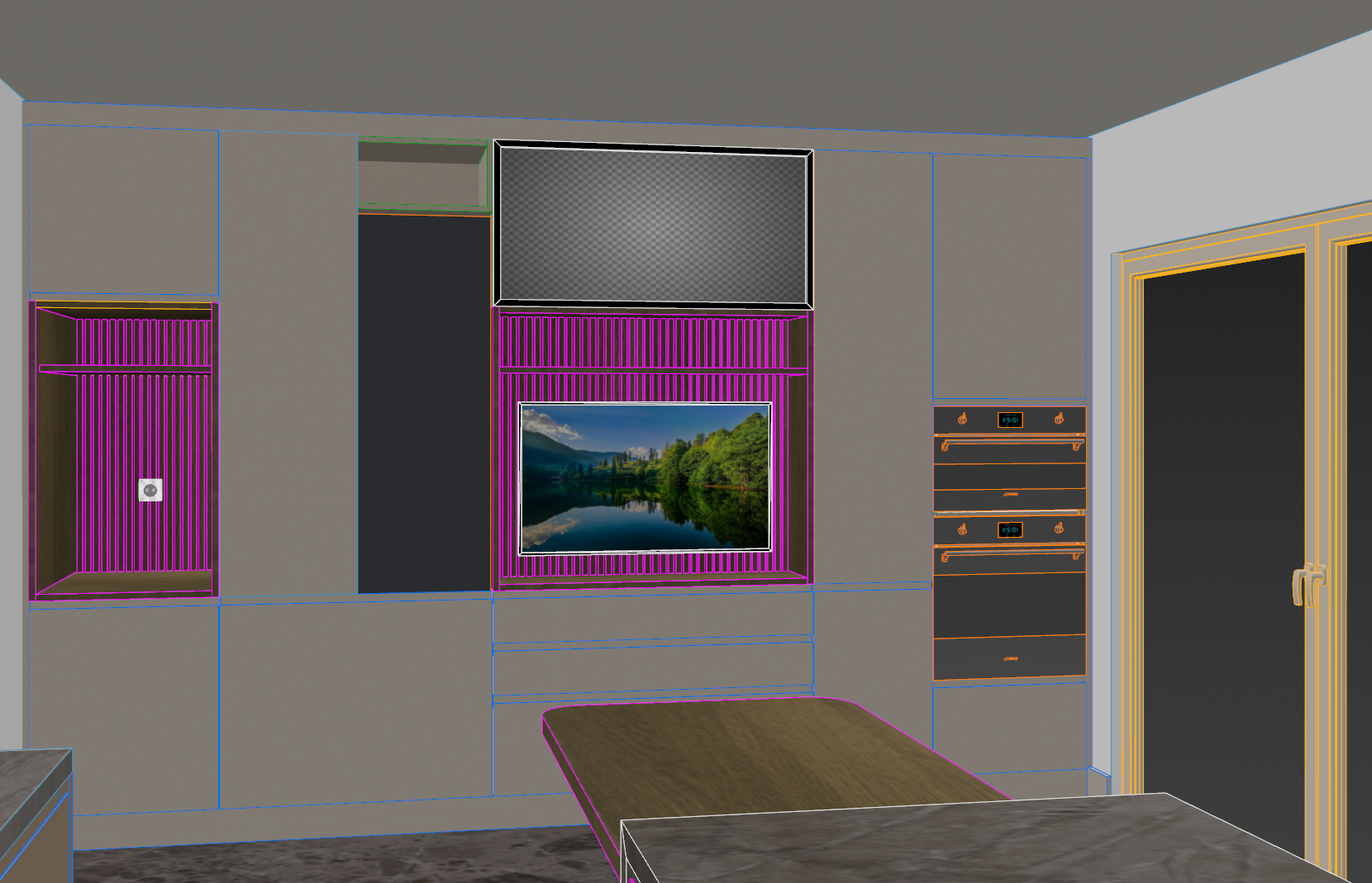 there should be spot lighting on the ceiling a coffee machine in front of the outlet led lighting under the shelves a sea view from the window and three cups on the shelf above the machine